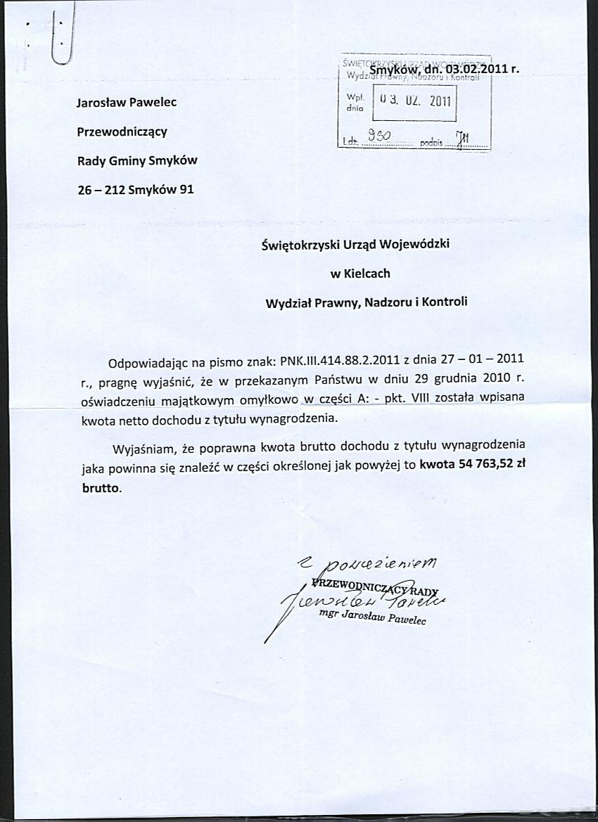 Wyjaśnienie do oświadczenia majątkowego złożonego Wojewodzie Świętokrzyskiemu przez Przewodniczącego Rady Gminy Smyków - Dariusza Janusa |