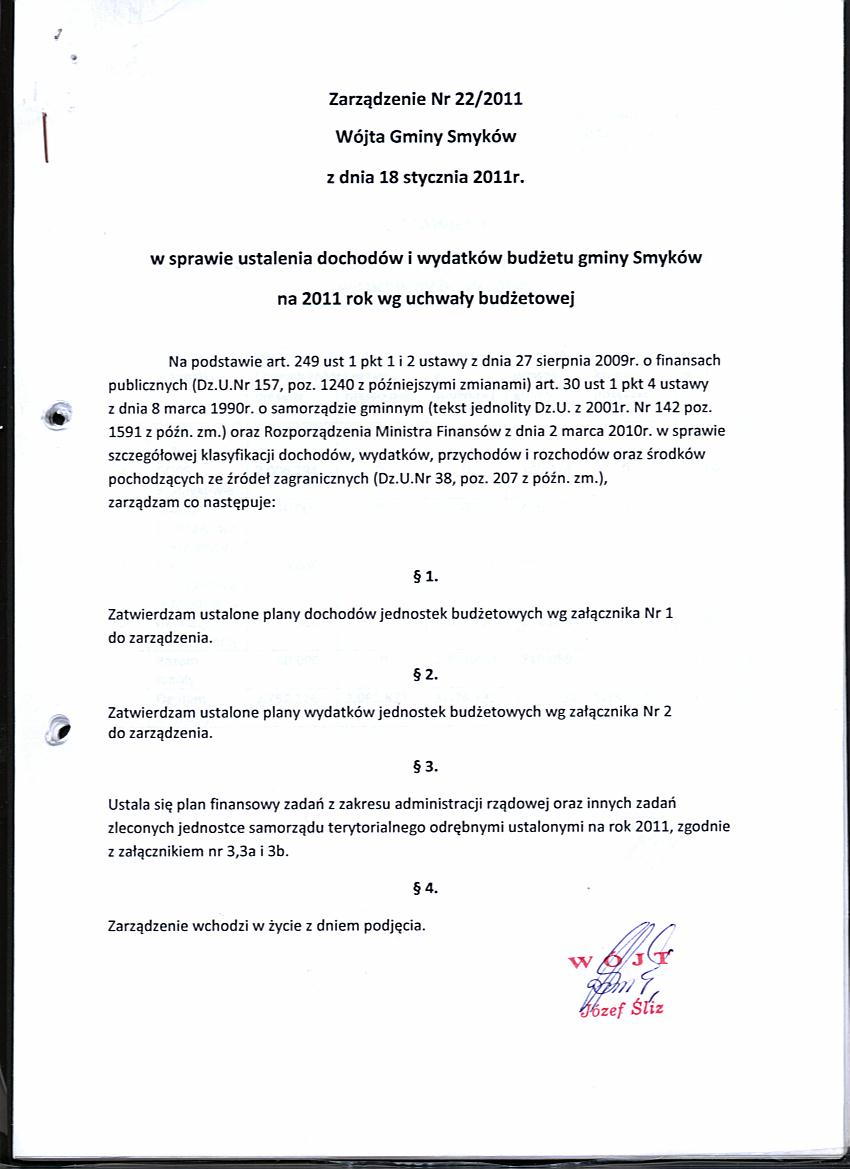 Zarządzenie Nr 22/2011 w sprawie ustalenia dochodów i wydatków budżetu gminy Smyków na 2011 rok wg uchwały budżetowej |