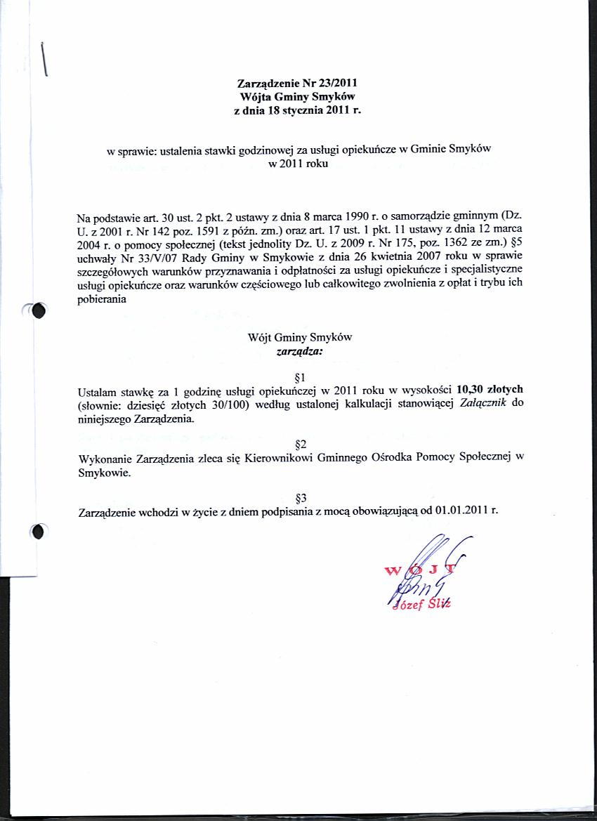 Zarządzenie Nr 23/2011 w sprawie ustalenia stawki godzinowej za usługi opiekuńcze w Gminie Smyków w 2011 roku |