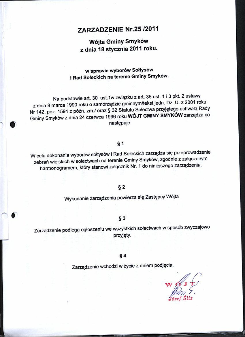 Zarządzenie Nr 25/2011 w sprawie wyborów Sołtysów i Rad Sołeckich na terenie Gminy Smyków |