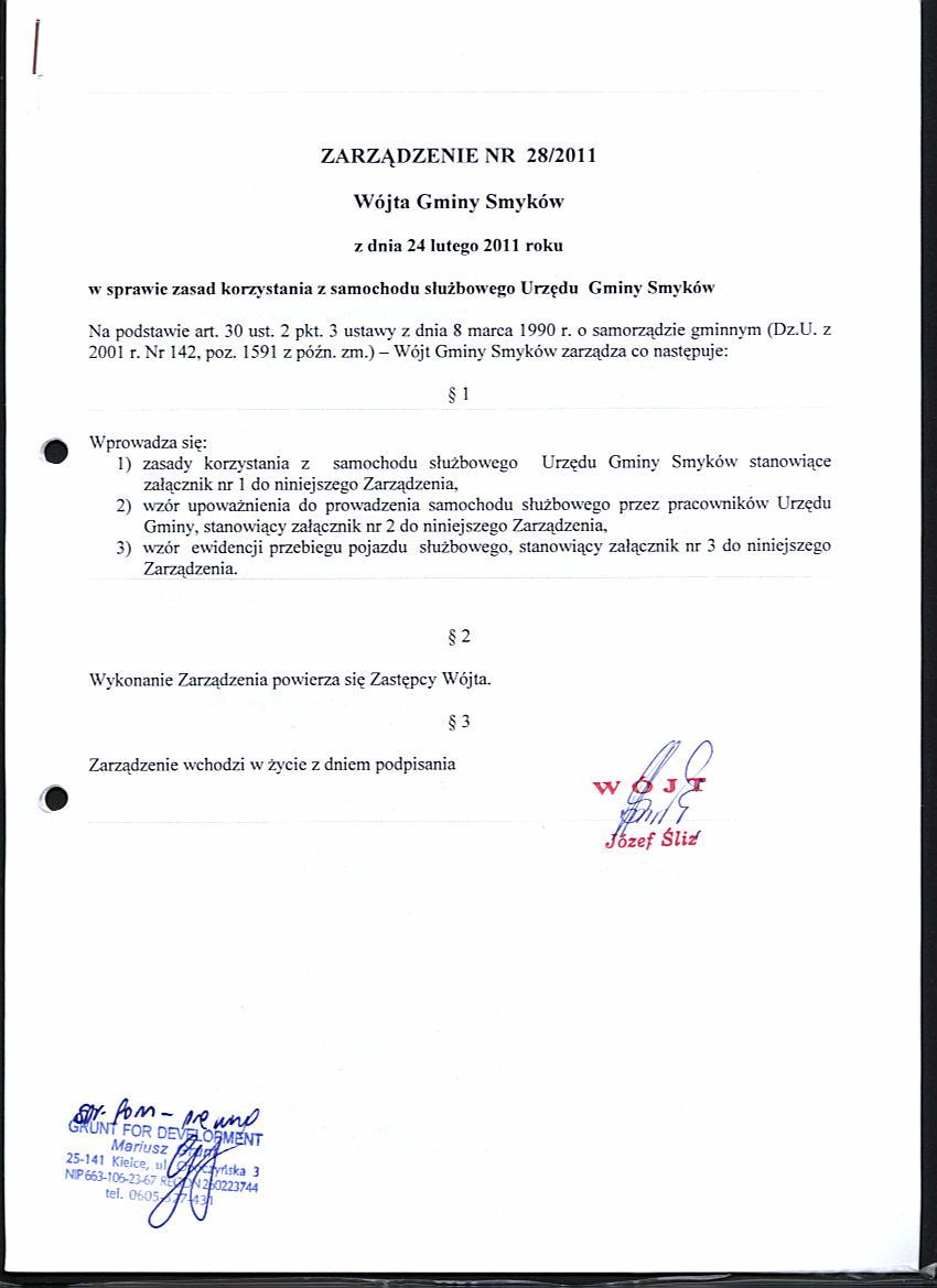 Zarządzenie Nr 28/2011 w sprawie zasad korzystania z samochodu służbowego Urzędu Gminy Smyków |