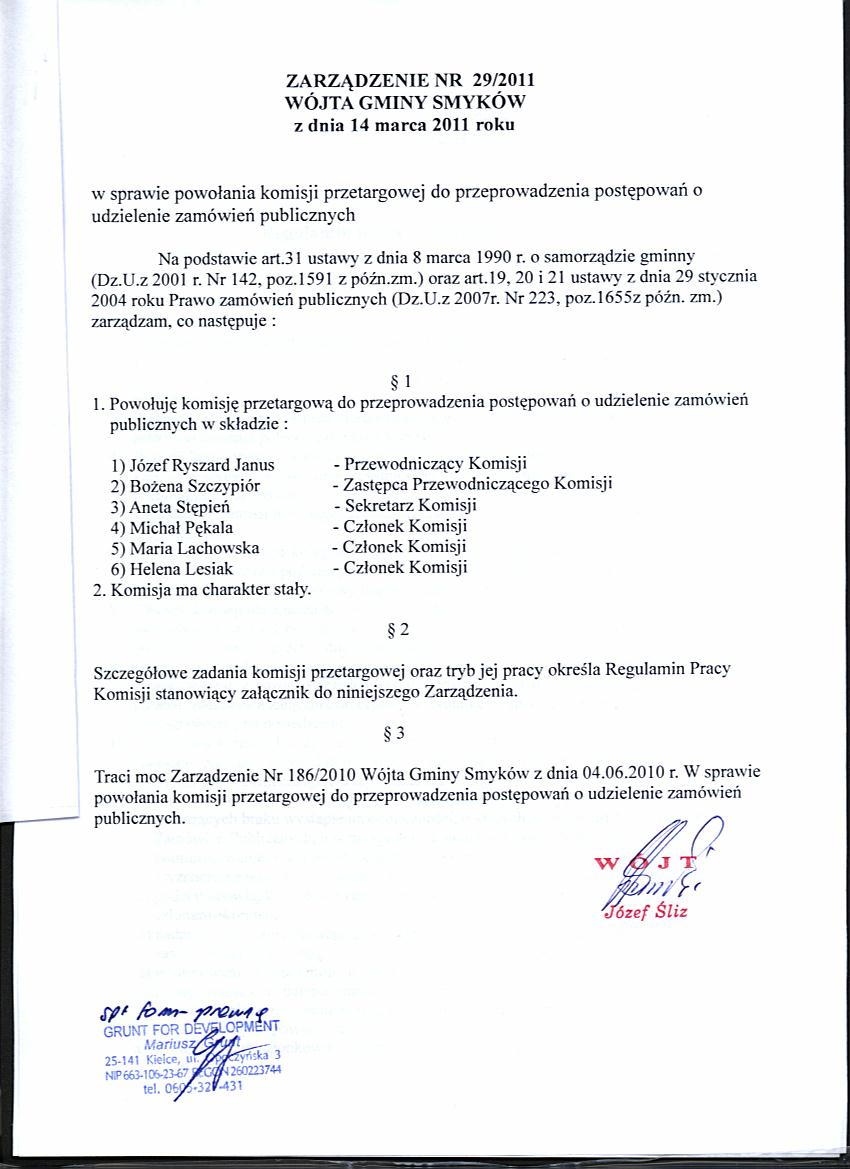 Zarządzenie Nr 29/2011 w sprawie powołania komisji przetargowej do przeprowadzenia postępowań o udzielenie zamówień publicznych |