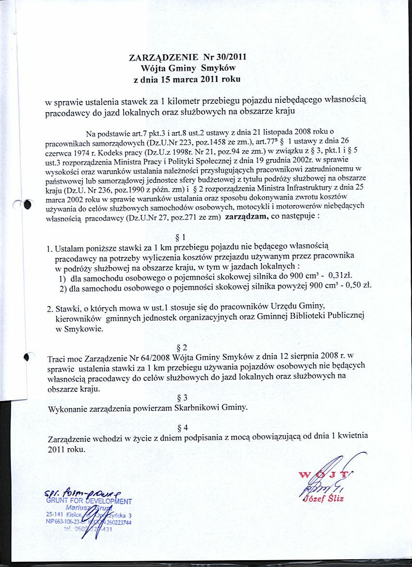 Zarządzenie nr 30/2011 w sprawie ustalenia stawek za 1 kilometr przebiegu pojazdu niebędącego własnością pracodawcy do jazd lokalnych oraz służbowych na obszarze kraju |