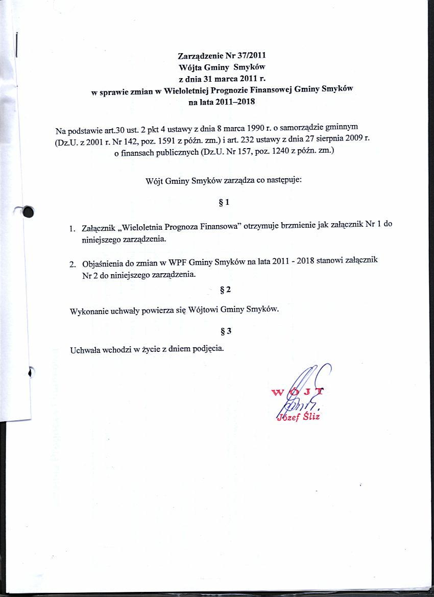 Zarządzenie Nr 37/2011 w sprawie zmian w Wieloletniej Prognozie Finansowej Gminy Smyków na lata 2011-2018 |