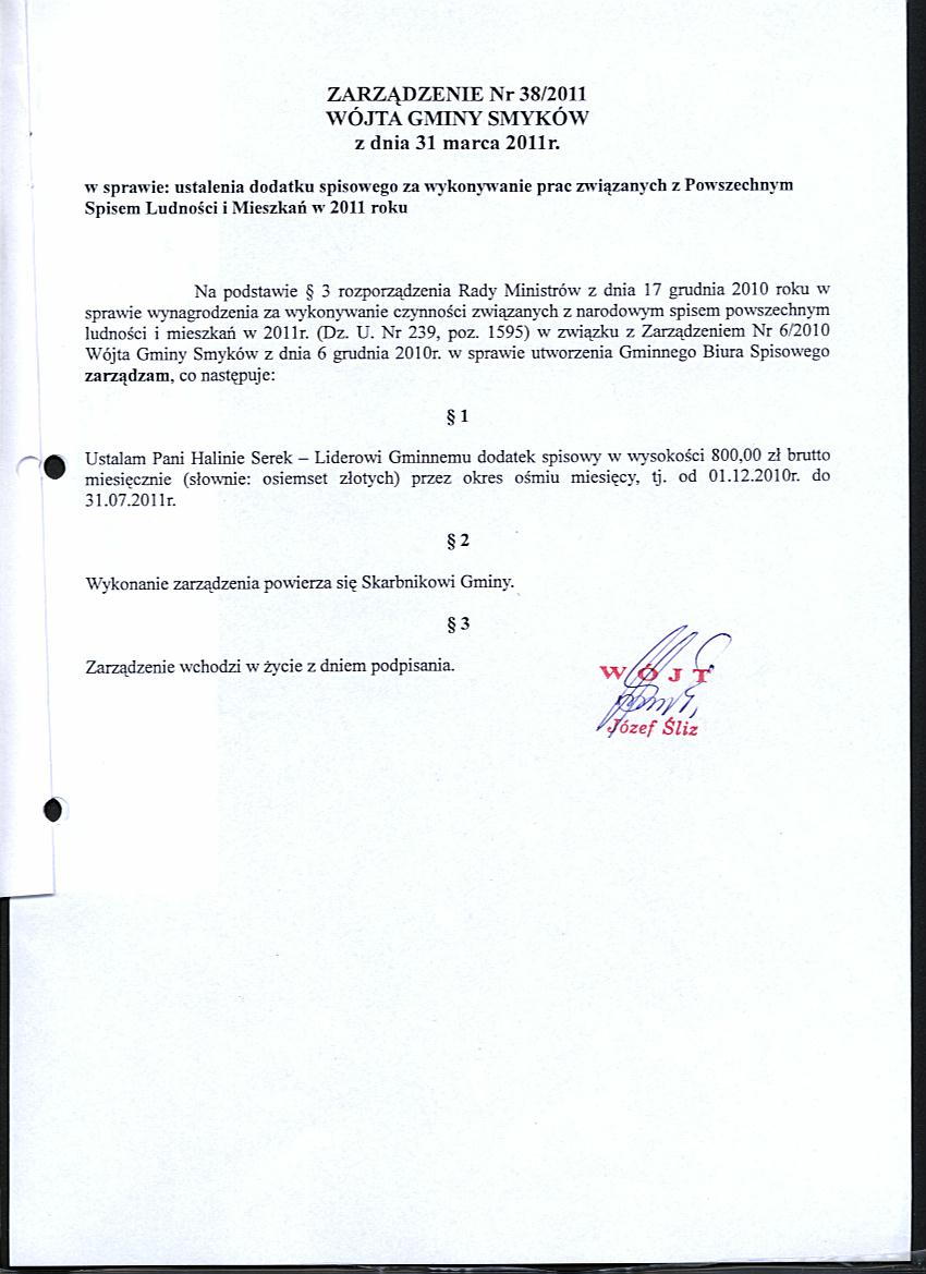 Zarządzenie Nr 38/2011 w sprawie ustalenia dodatku spisowego za wykonanie prac związanych z Powszechnym Spisem Ludności i Mieszkań w 2011 roku |