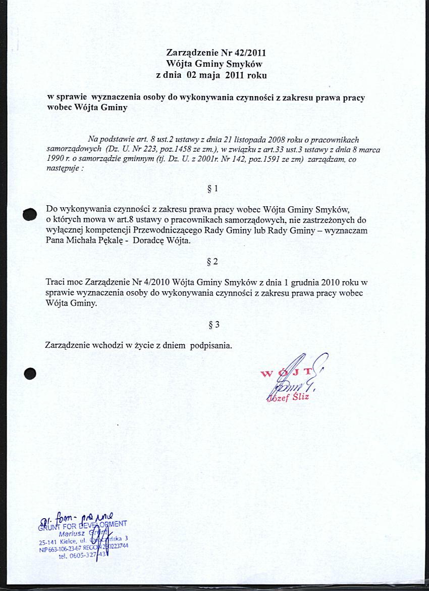 Zarządzenie Nr 42/2011 w sprawiewyznaczenia osoby do wykonywania czynności z zakresu prawa pracy wobec Wójta Gminy |