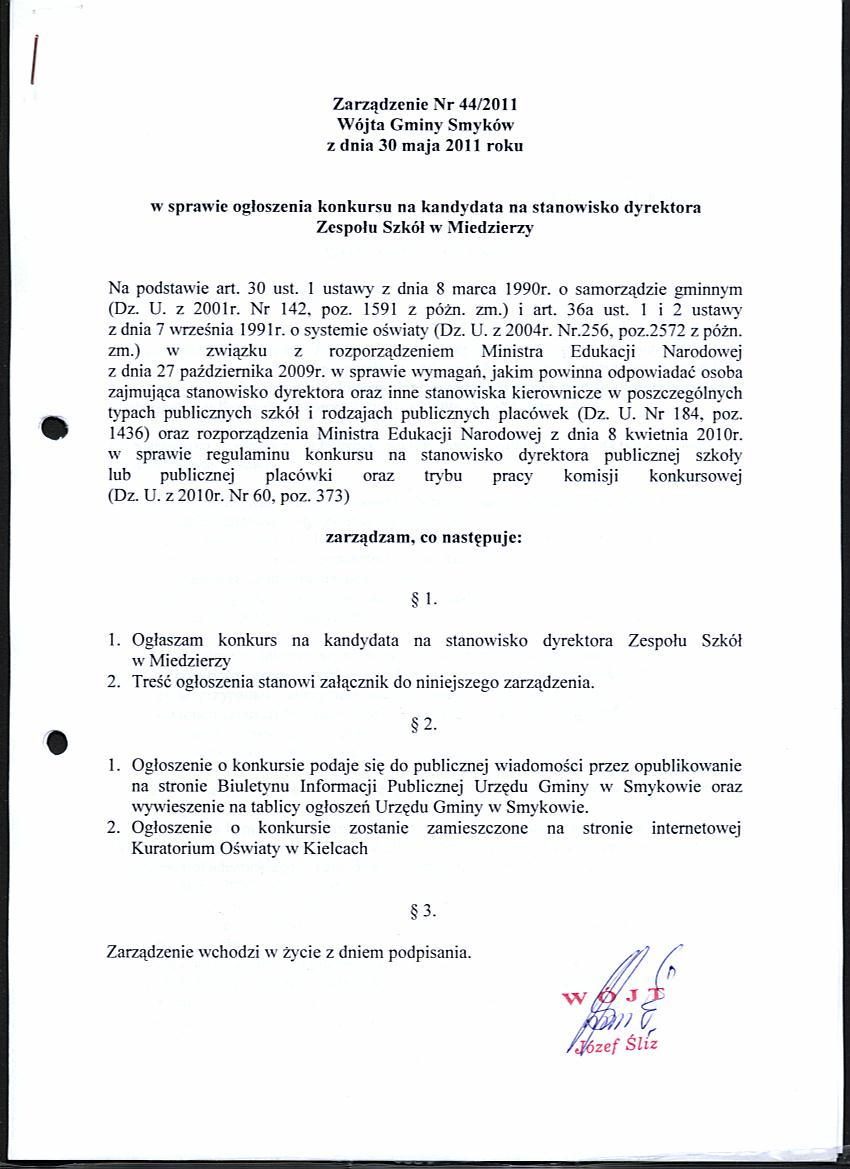 Zarządzenie Nr 44/2011 w sprawie ogłoszenia konkursu na kandydata na stanowisko dyrektora Zespołu Szkół w Miedzierzy |