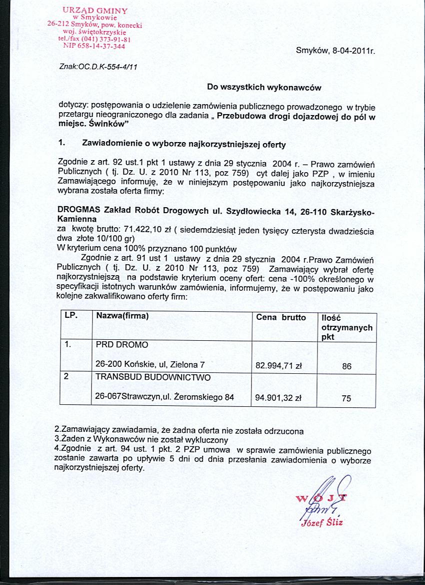 Zawiadomienie o wyborze najkorzystniejszej oferty - dotyczy przetargu nieograniczonego na budowę kanalizacji w gminie Smyków - Etap 1 Matyniów (włączenie do istniejącej kanalizacji), Smyków część północna |