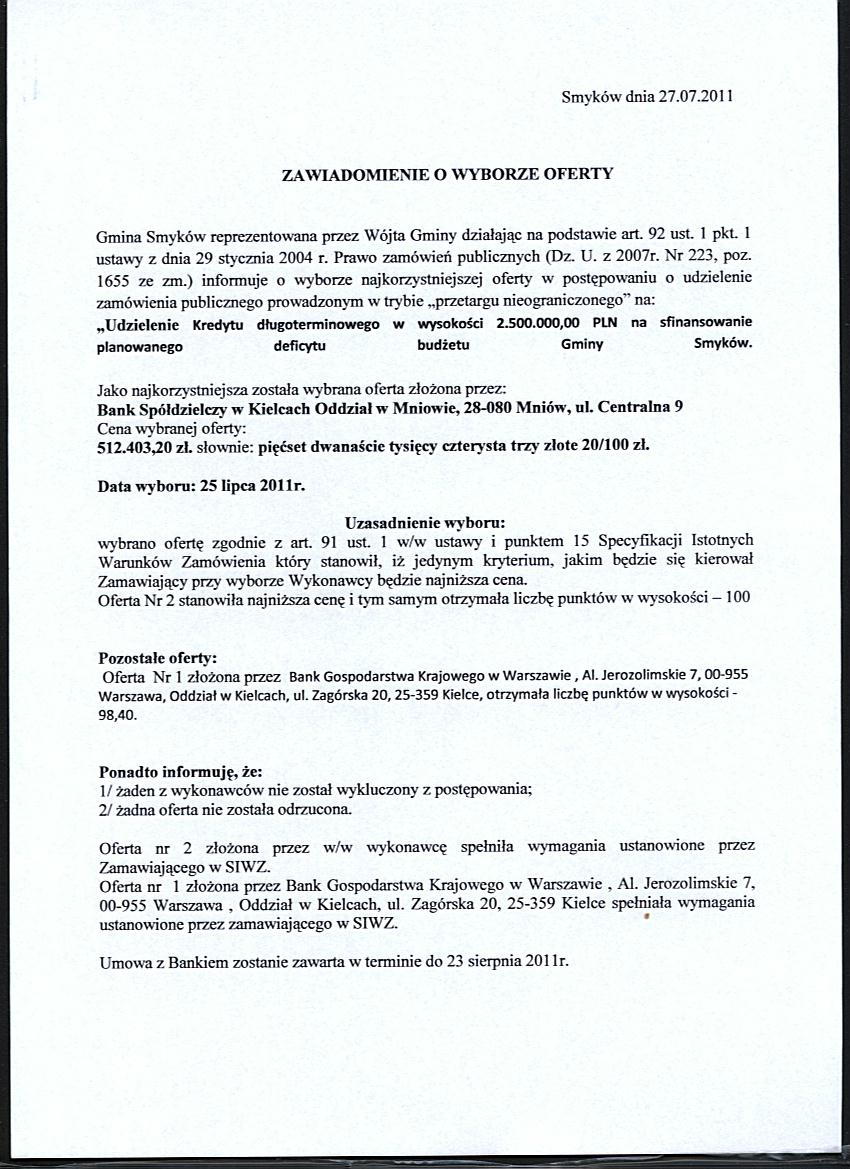 Udzielenie Kredytu długoterminowego w wysokości 2.500.000,00 PLN na sfinansowanie planowanego deficytu budżetu Gminy Smyków |