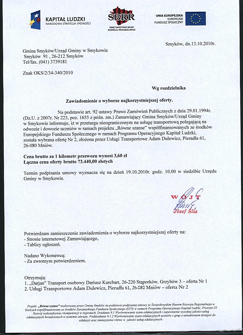Zawiadomienie o wyborze najkorzystniejszej oferty - dotyczy, - usługi transportowaejodwóz i dowóz uczniów na zajęcia w ramach projektu Akademia kompetencji kluczowych w gminie Smyków współfinansowanego ze środków Unii Europejskiej w ramach Europejskiego Funduszu Społecznego Program Operacyjny Kapitał Ludzki, Priorytet IX, Działanie 9.1, Poddziałanie 9.1.2. Wyrównywanie szans edukacyjnych uczniów z grup o utrudnionym dostępie do edukacji oraz zmniejszanie różnic w jakości usług edukacyjnych |