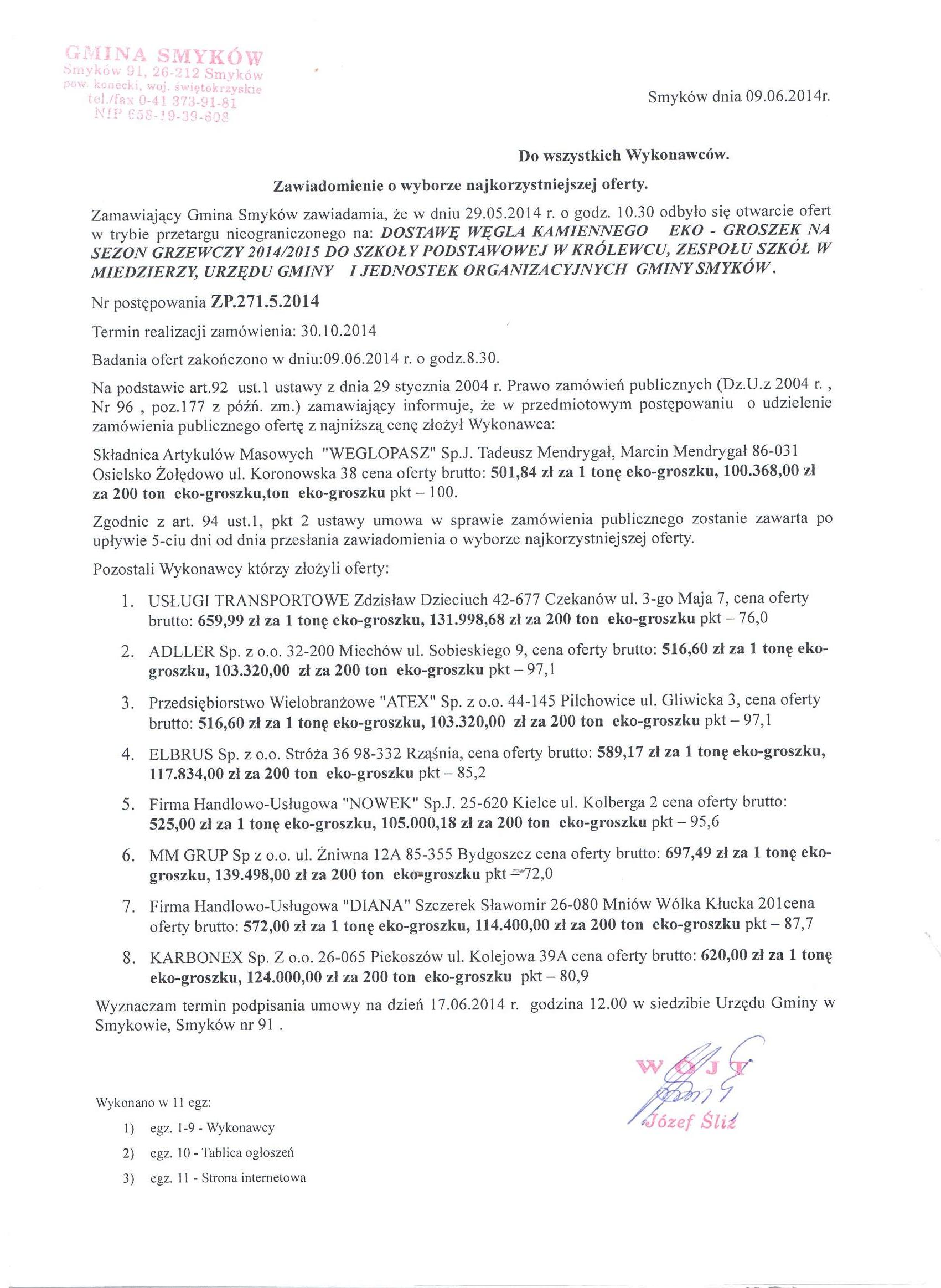 Zawiadomienie o wyborze najkorzystniejszej oferty: dotyczy Dostawa węgla kamiennego eko - groszek na sezon grzewczy 2014/2015 do Szkoły Podstawowej w Królewcu, Zespołu Szkół w Miedzierzy, Urzędu Gminy i jednostek organizacyjnych Gminy Smyków |