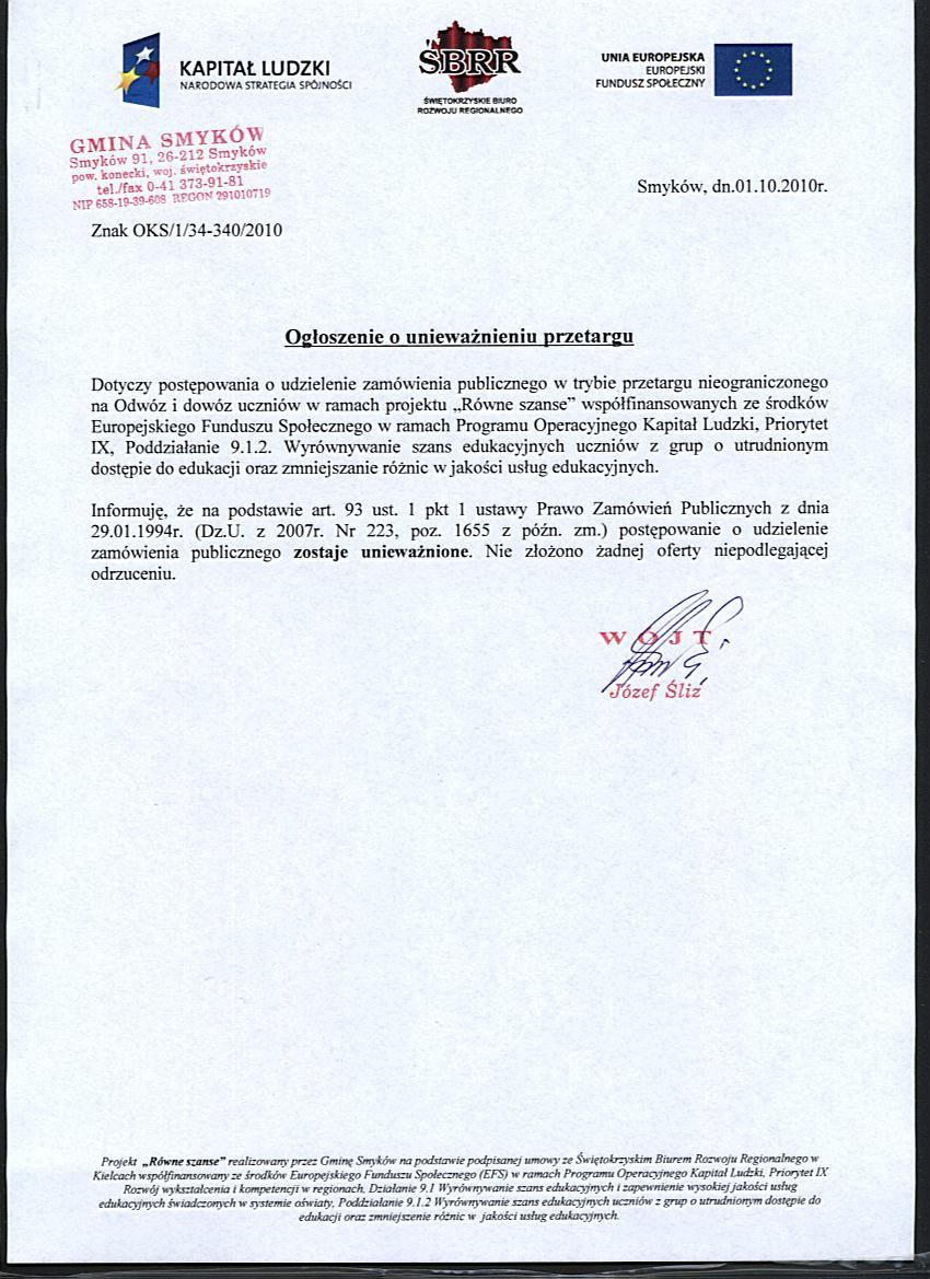 Ogłoszenie o unieważnieniu przetargu Odwóz i dowóz uczniów w ramach projektu "Równe szanse" |