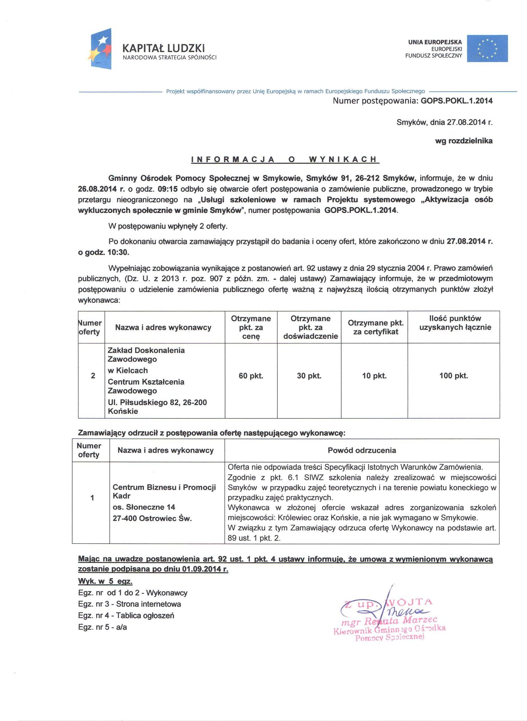Usługi szkoleniowe na rzecz Odbiorców Projektu Systemowego „Aktywizacja osób wykluczonych społecznie w gminie Smyków”