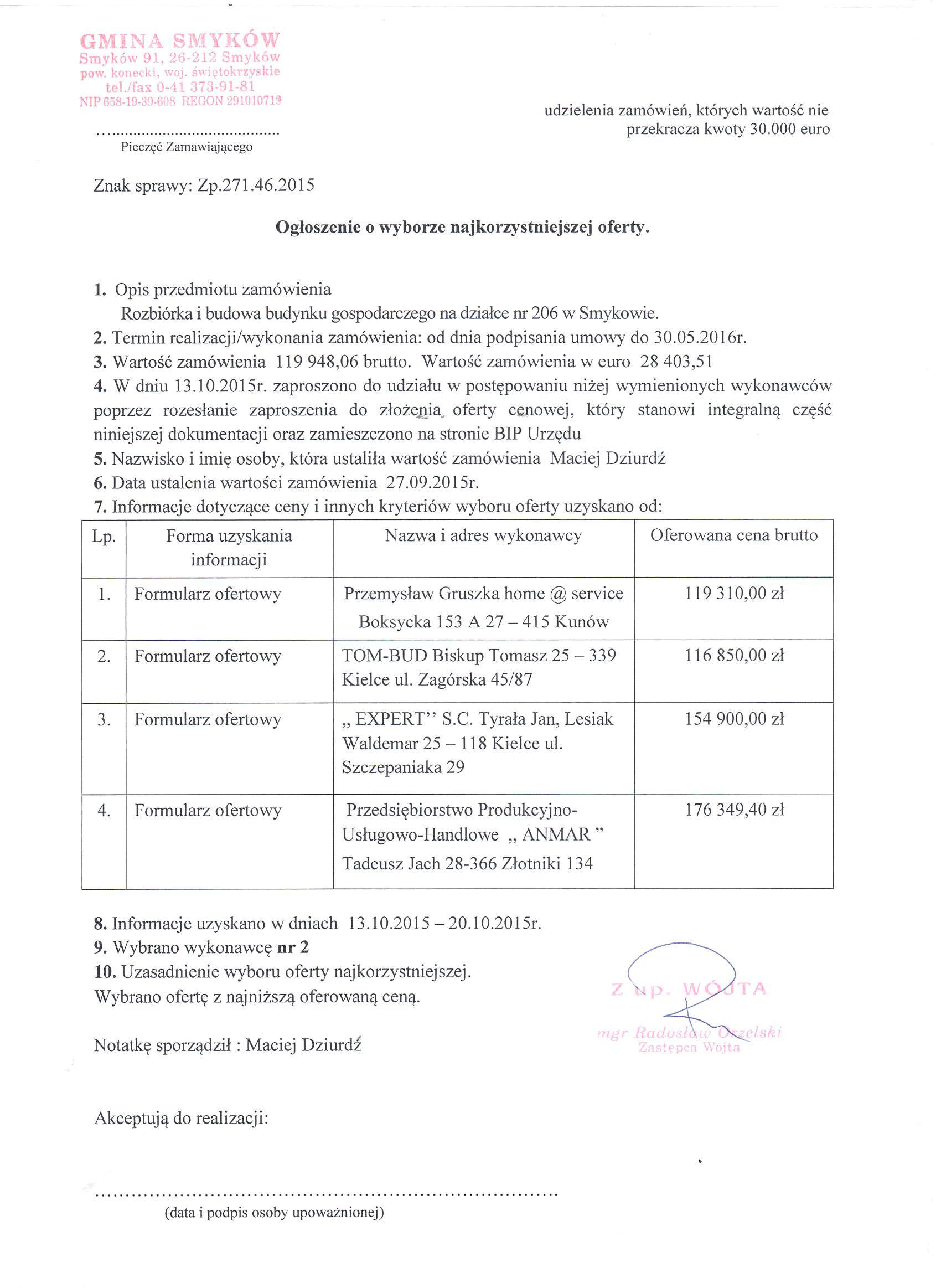Ogłoszenie o wyborze najkorzystniejszej oferty dotyczy: Rozbiórka i budowa budynku gospodarczego na działce nr 206 w Smykowie |