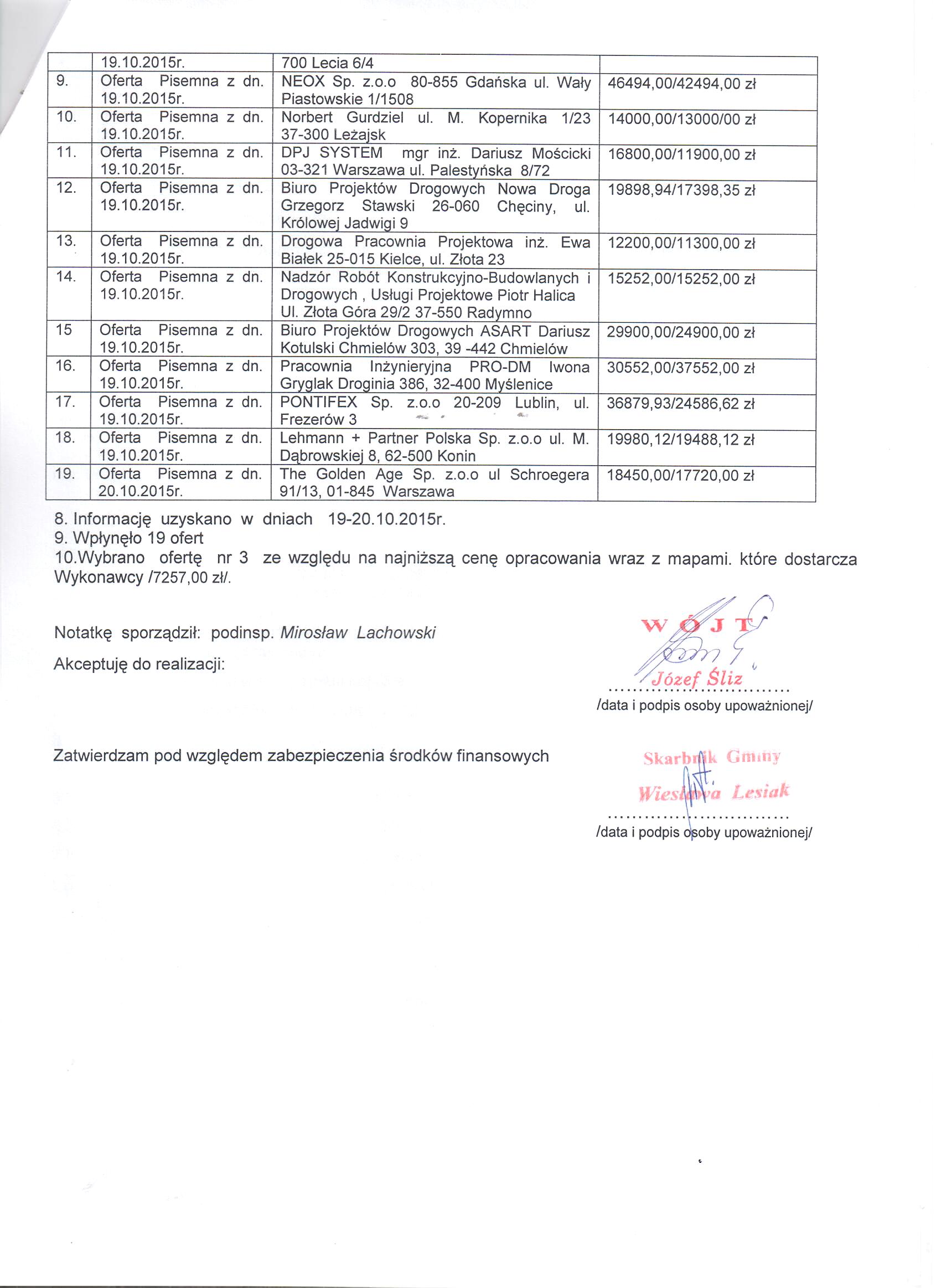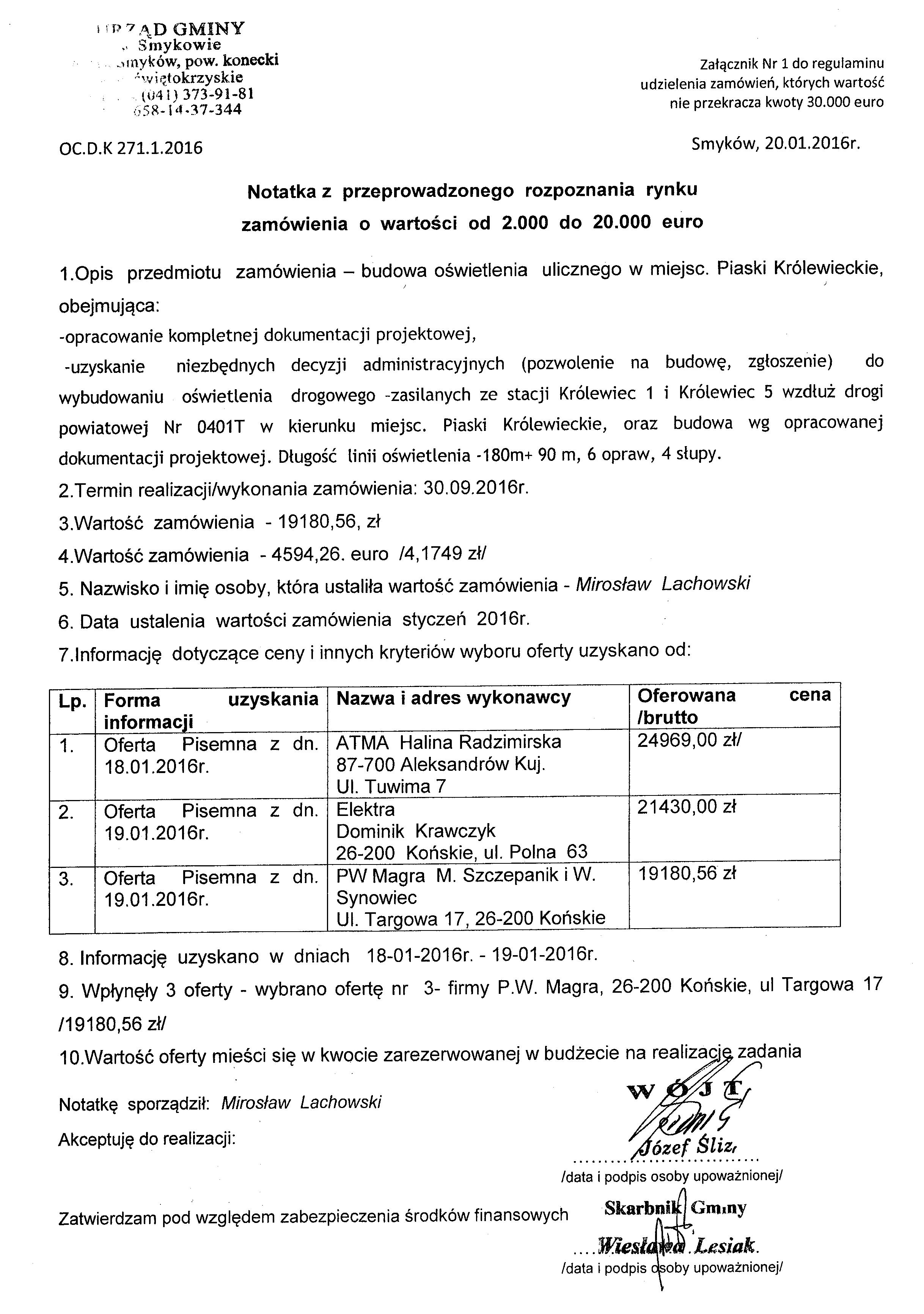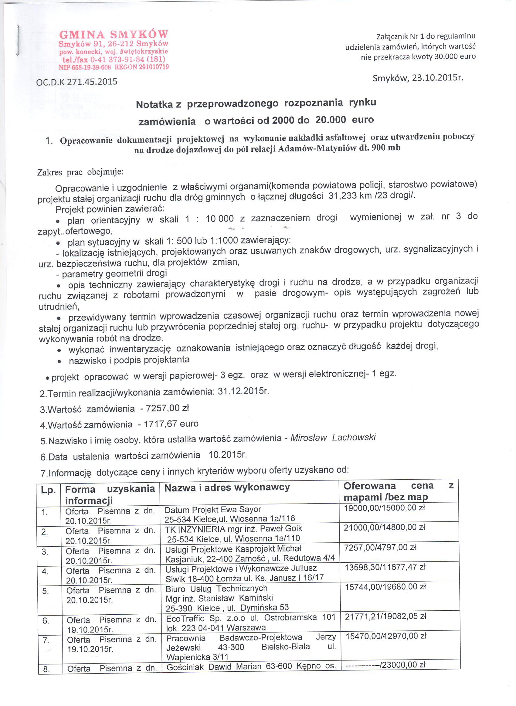 Notatka z otwarcia kopert z ofertami dotyczy zapytania ofertowego:Opracowanie projektu stałej organizacji ruchu dla dróg gminnych na terenie gm. Smyków |
