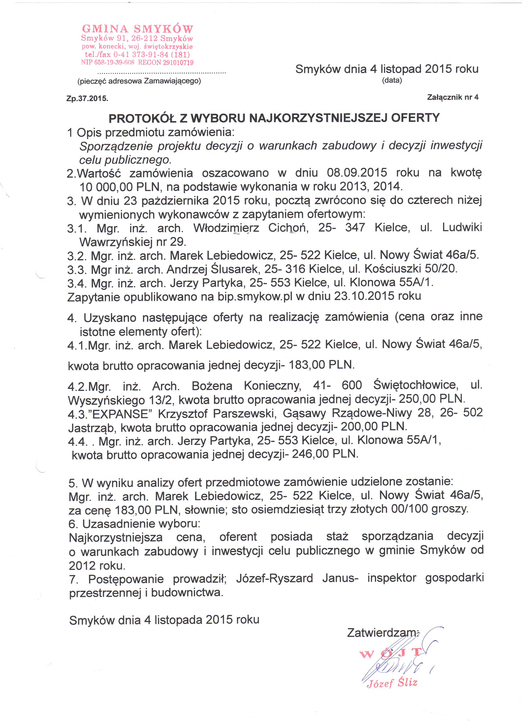 Protokół z wyboru najkorzystniejszej oferty dotyczy: opracowania dokumentu pn. Program rewitalizacji Gminy Smyków na lata 2016 - 2023 |