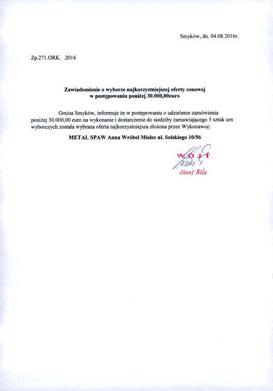 Zawiadomienie o wyborze najkorzystniejszej oferty cenowej na wykonanie i dostawę urn wyborczych |