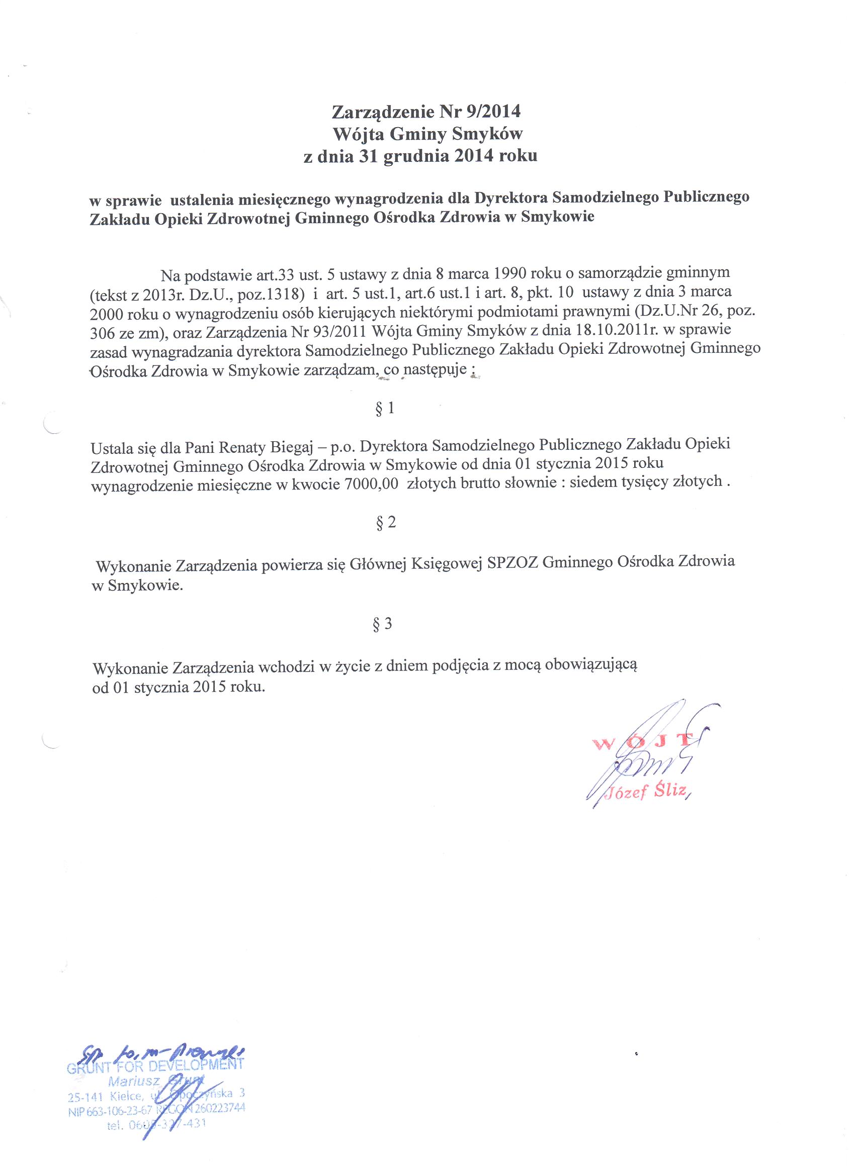Zarządzenie 9/2014 w sprawie ustalenia miesięcznego wynagrodzenia dla Dyrektora Samodzielnego Publicznego Zakładu Opieki Zdrowotnej Gminnego Ośrodka Zdrowia w Smykowie |