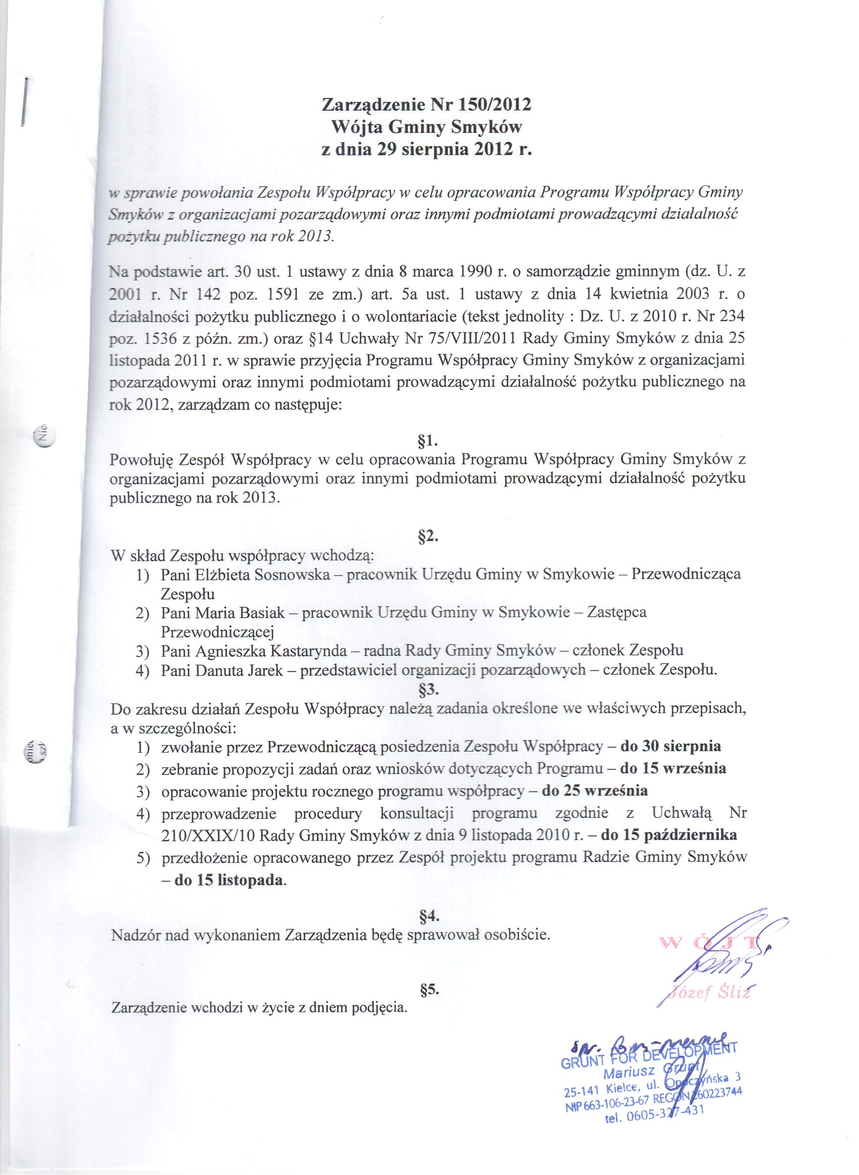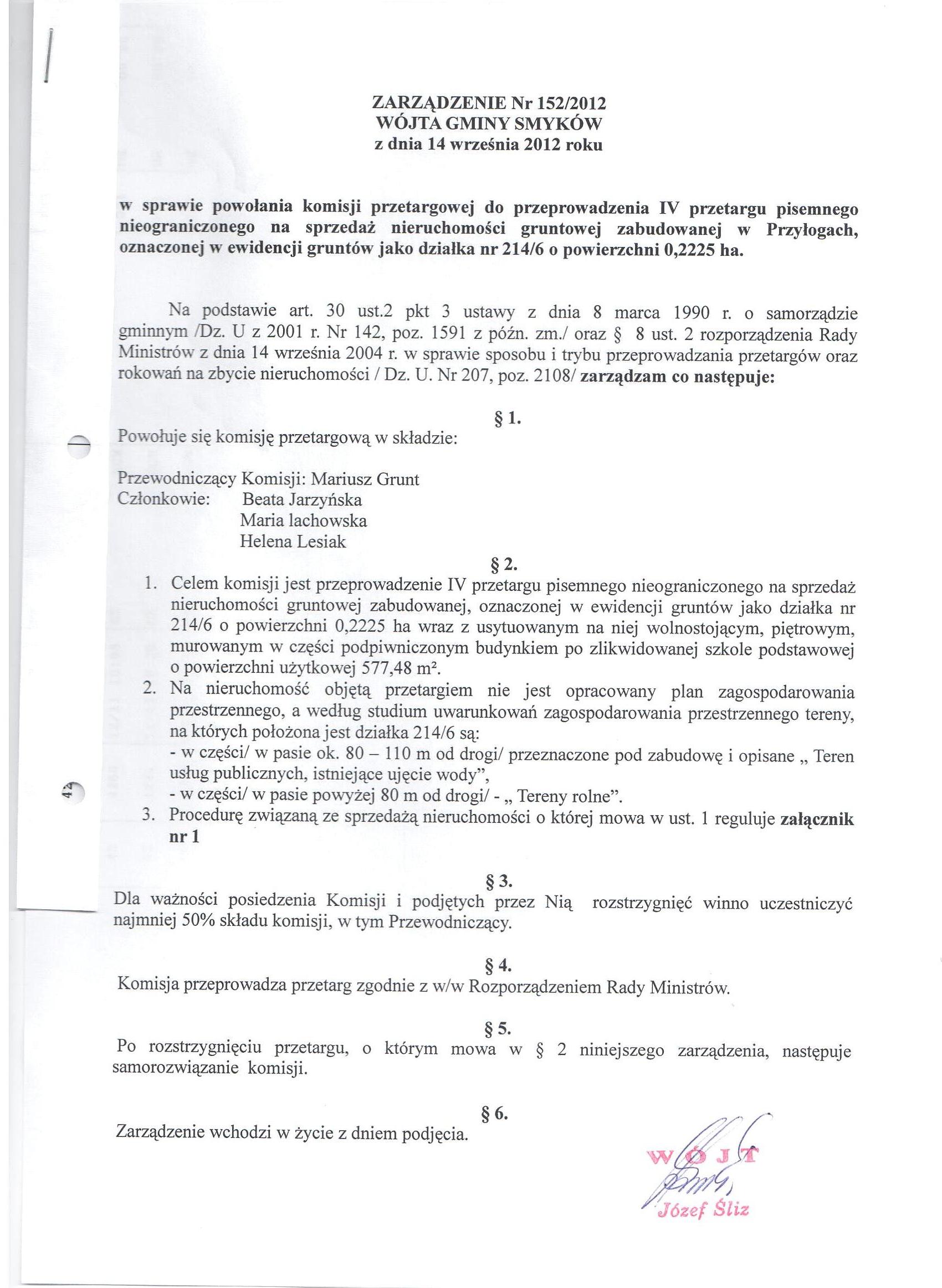 Zarządzenie 125/2012 w sprawie powołania Zastępcy Wójta Gminy Smyków |