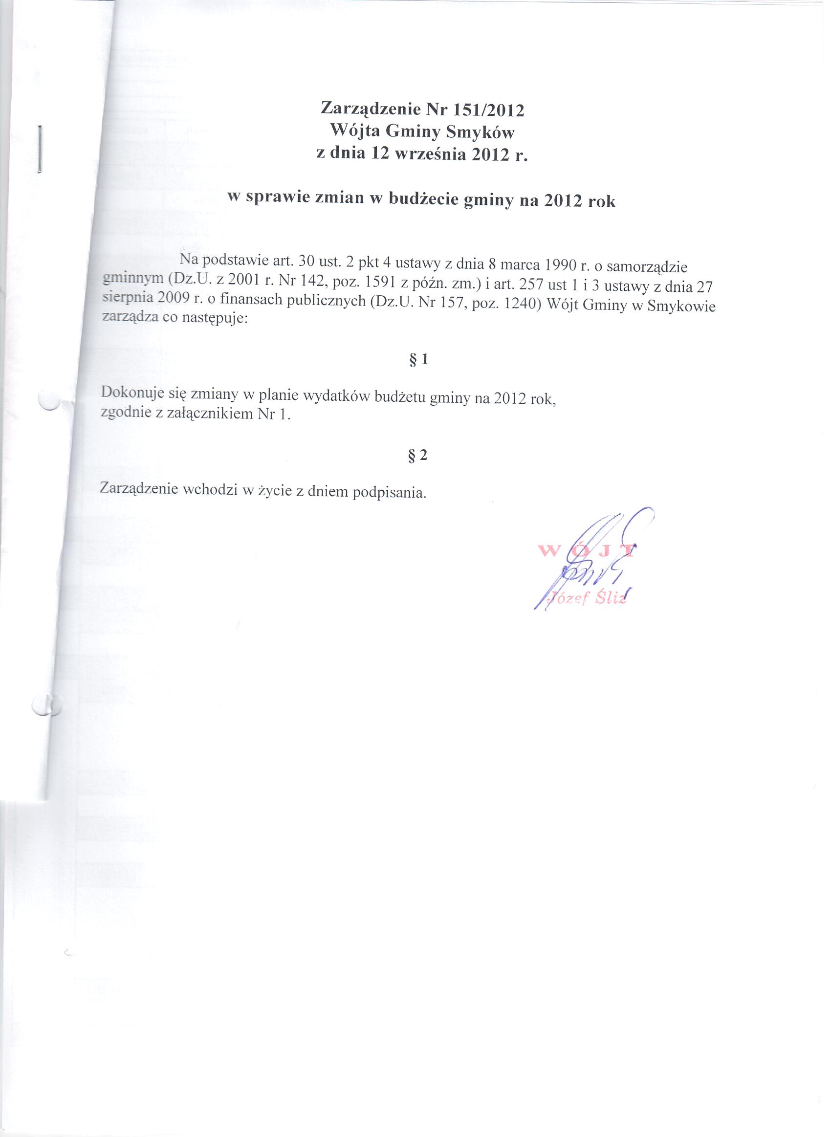 Zarządzenie 151/2012 w sprawie zmian w budżecie gminy na 2012 rok. |
