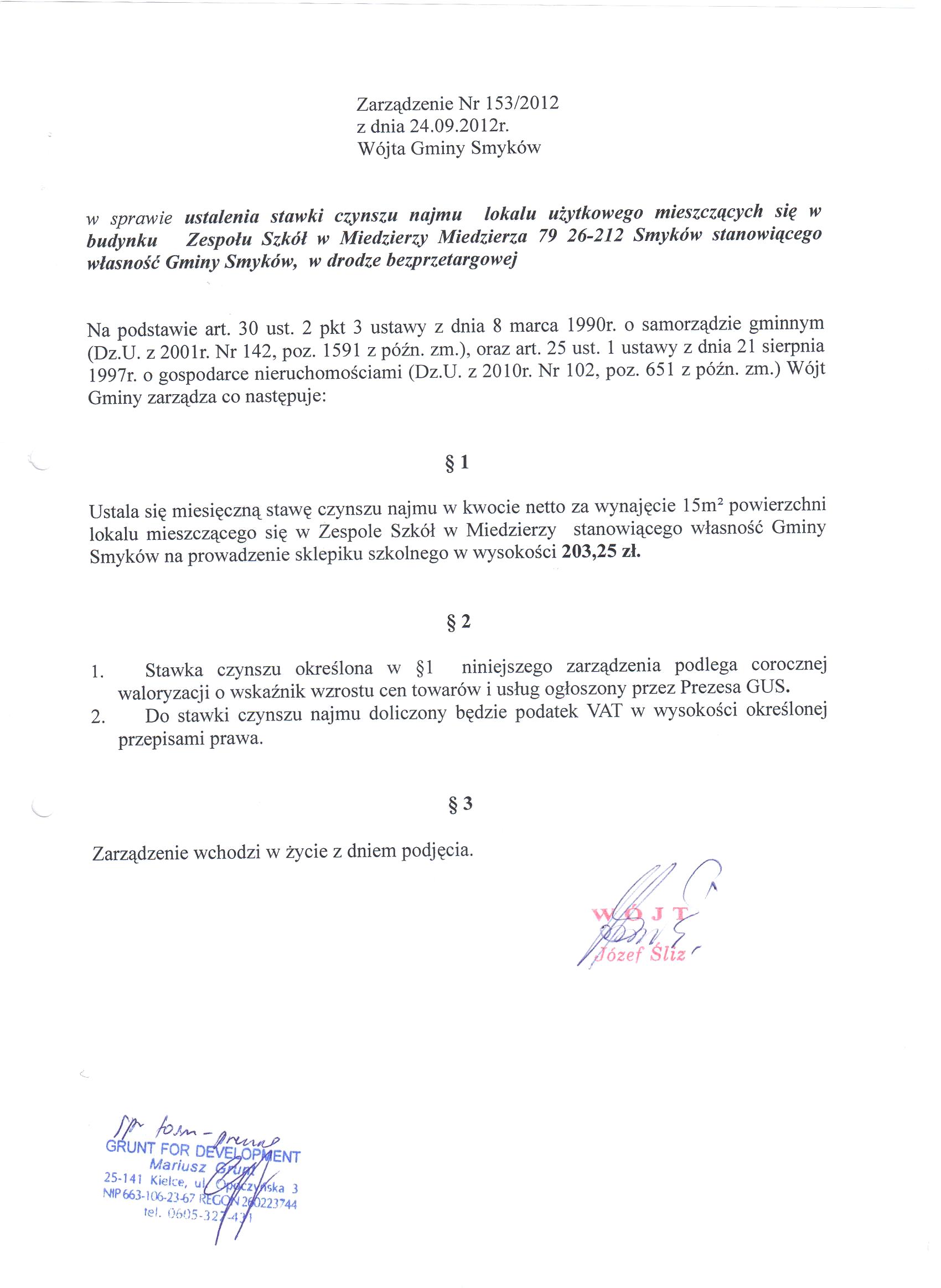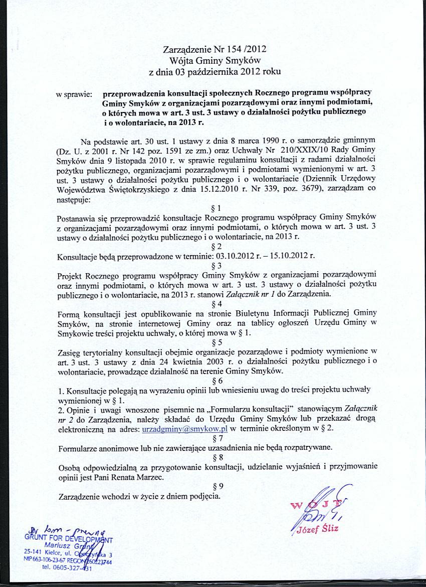Zarządzenie 169/2012 w sprawie określenia zasad umieszczania reklam i oznaczeń przedsiębiorcy na nieruchomosciach będących własnością Gminy Smyków oraz ustalania opłat z tego tytułu |