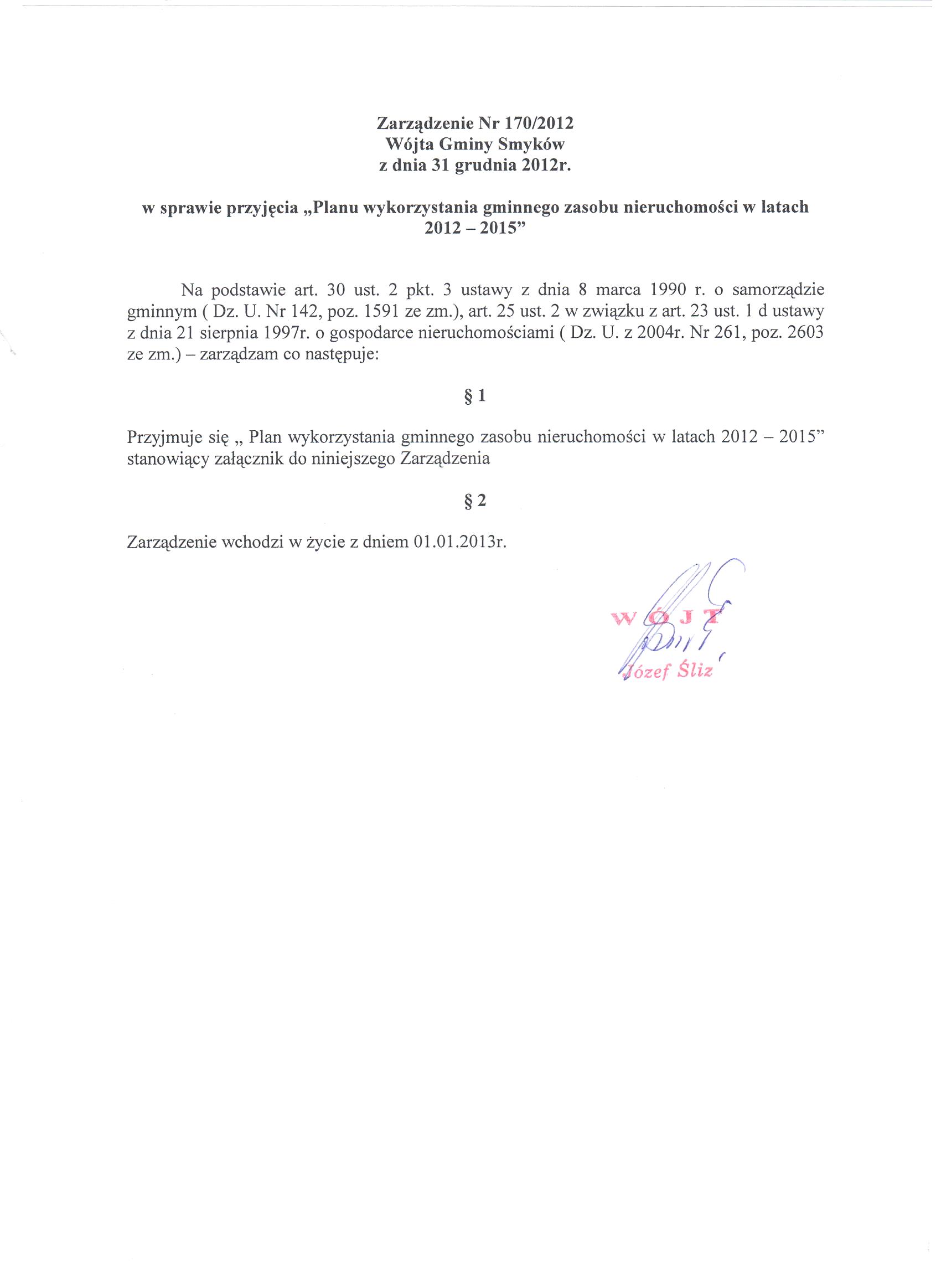 Zarządzenie 170 w sprawie przyjęcia " Planu wykorzystania gminnego zasobu nieruchomości w latach 2012-2015" |