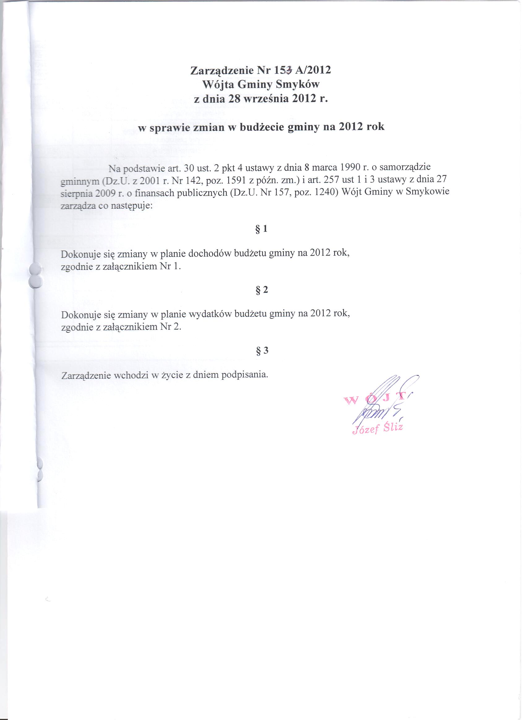 Zarządzenie 153 A/2012 w sprawie zmian w budżecie gminy na 2012 rok |