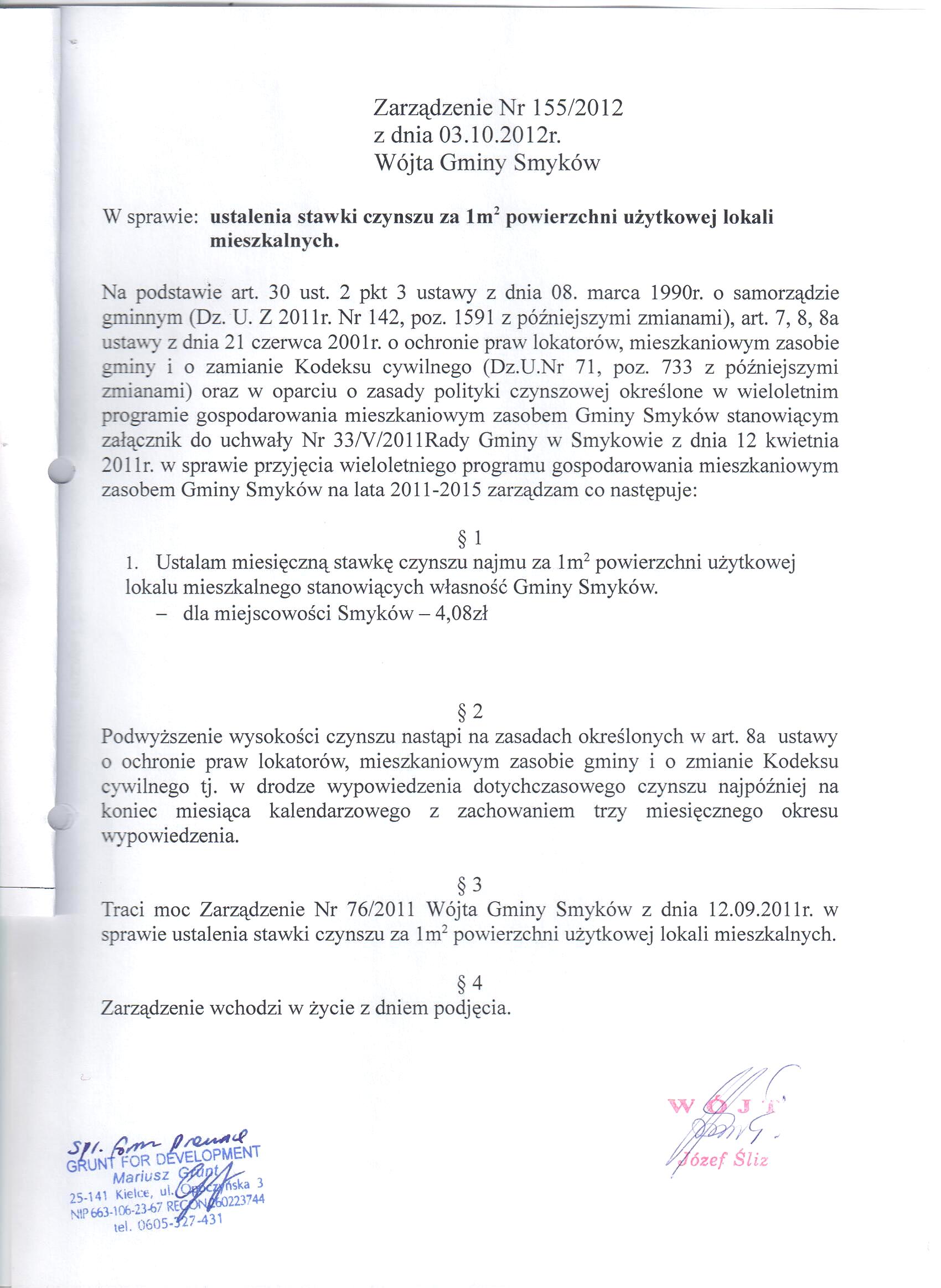 Zarządzenie 155/2012 w sprawie ustalenia stawki czynszu za 1m2 powierzchni użytkowych lokali mieszkalnych. |