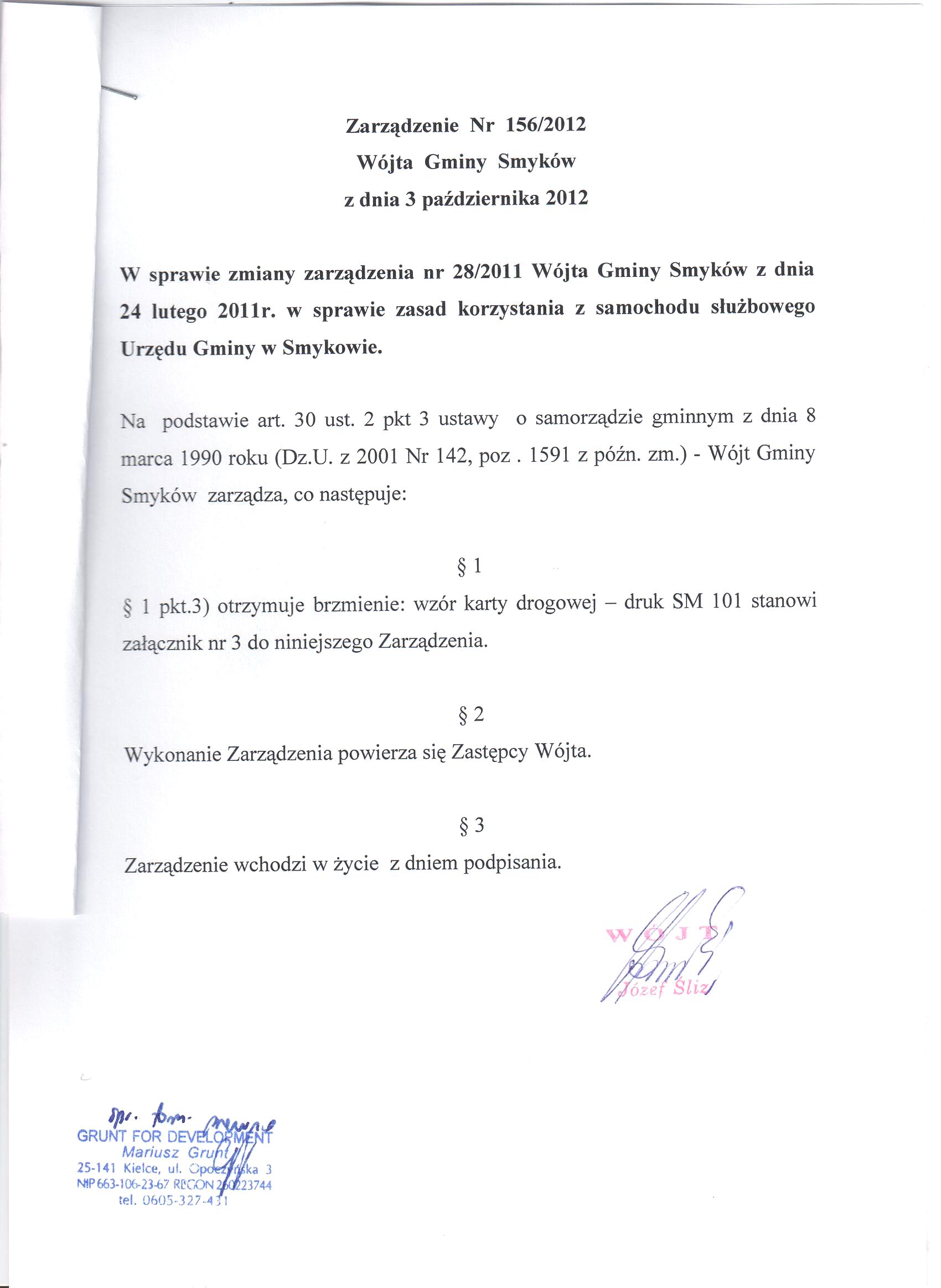 Zarządzenie 156/2012 w sprawie zmiany zarządzenia nr 28/2011 Wójta Gminy Smyków z dnia 24 lutego 2011 roku w sprawie zasad korzystania z samochodu służbowego Urzędu Gminy w Smykowie. |