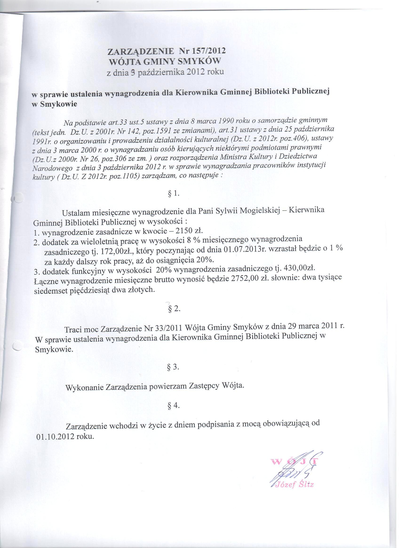 Zarządzenie 157/2012 w sprawie ustalenia wynagrodzenia dla Kirownika Gminnej Biblioteki Publicznej w Smykowie |