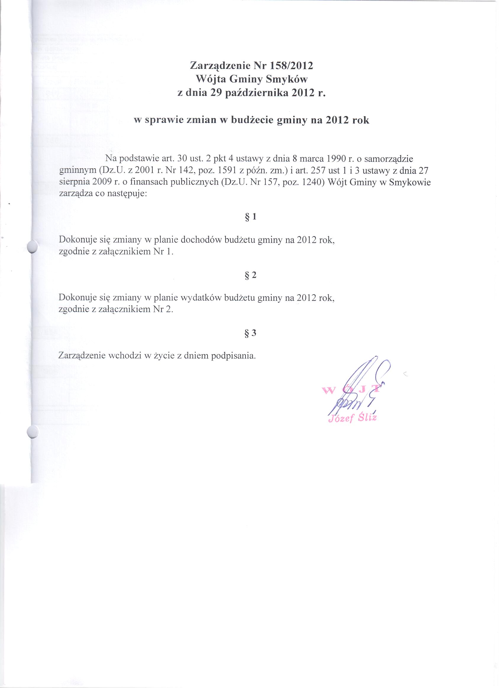 Zarządzenie 158/2012 w sprawie zmian w budżecie gminy na 2012 rok. |