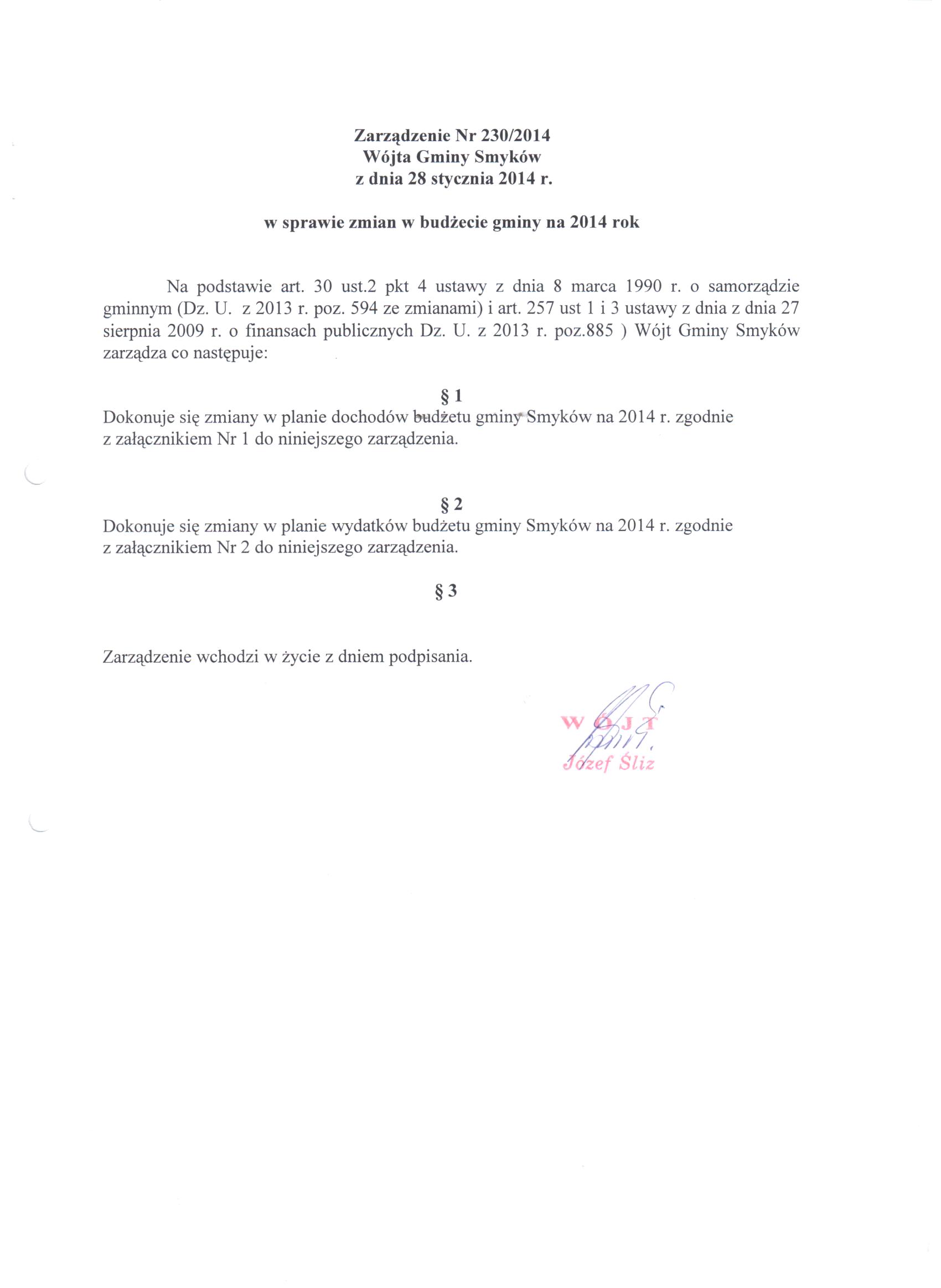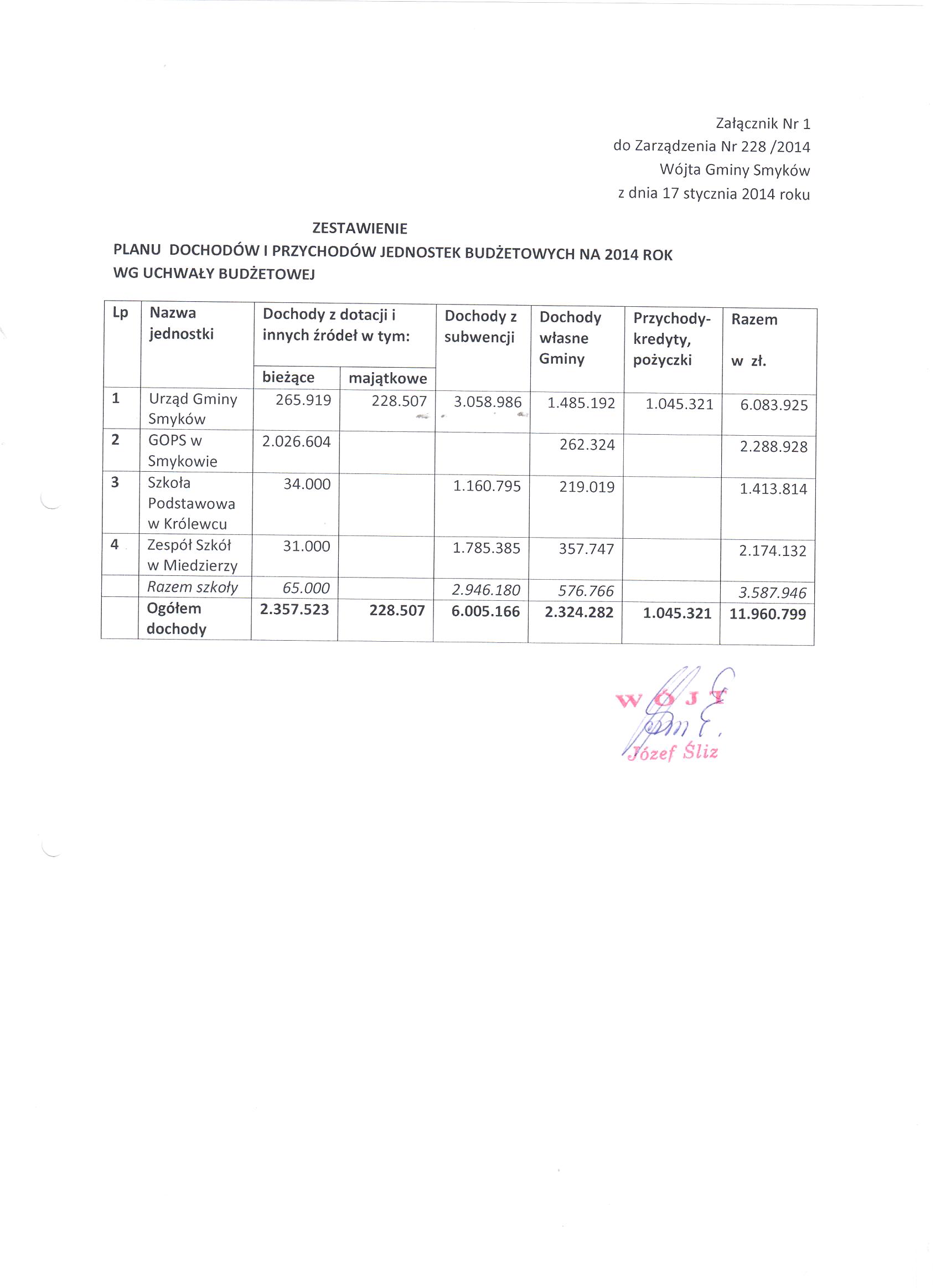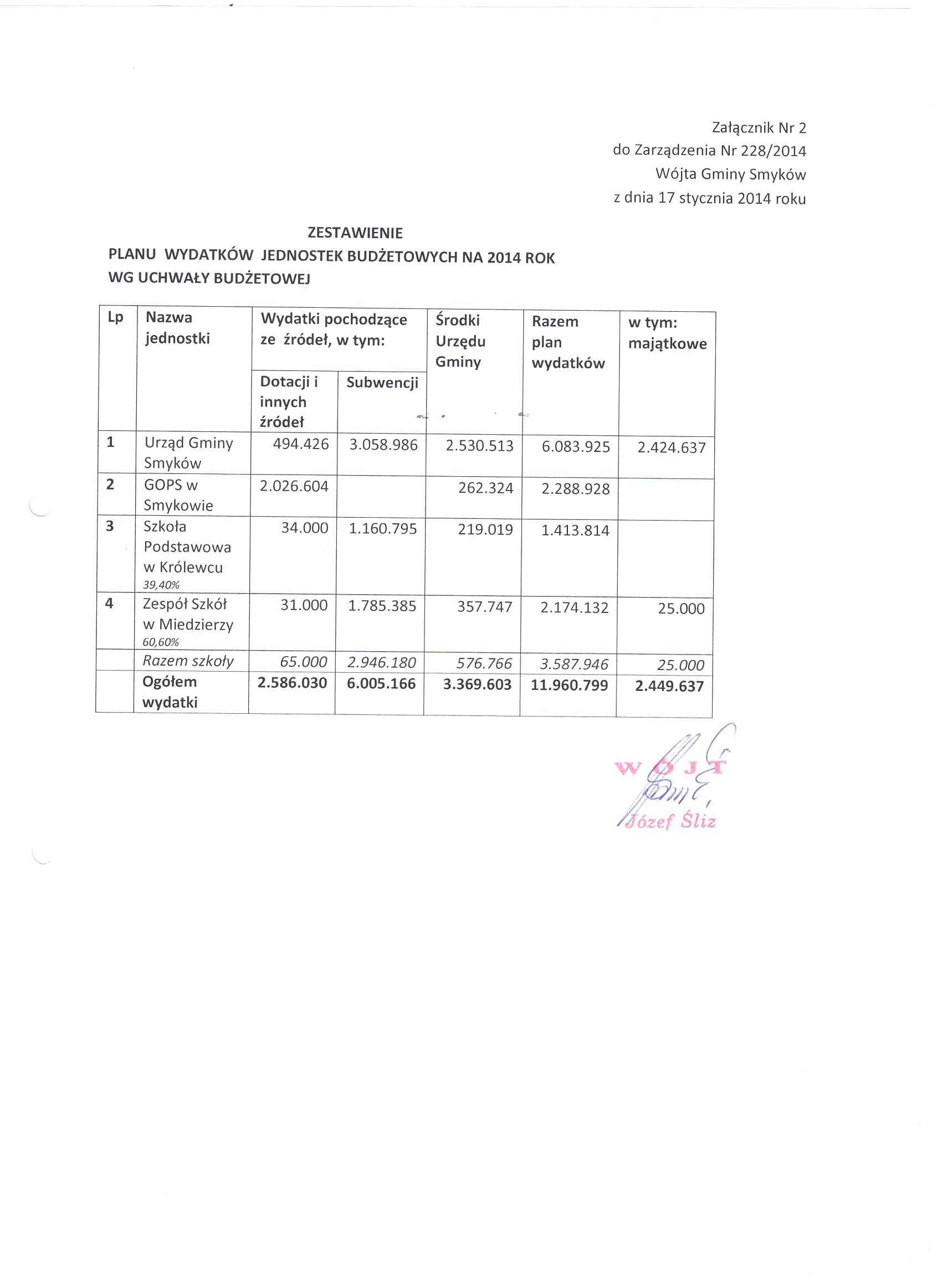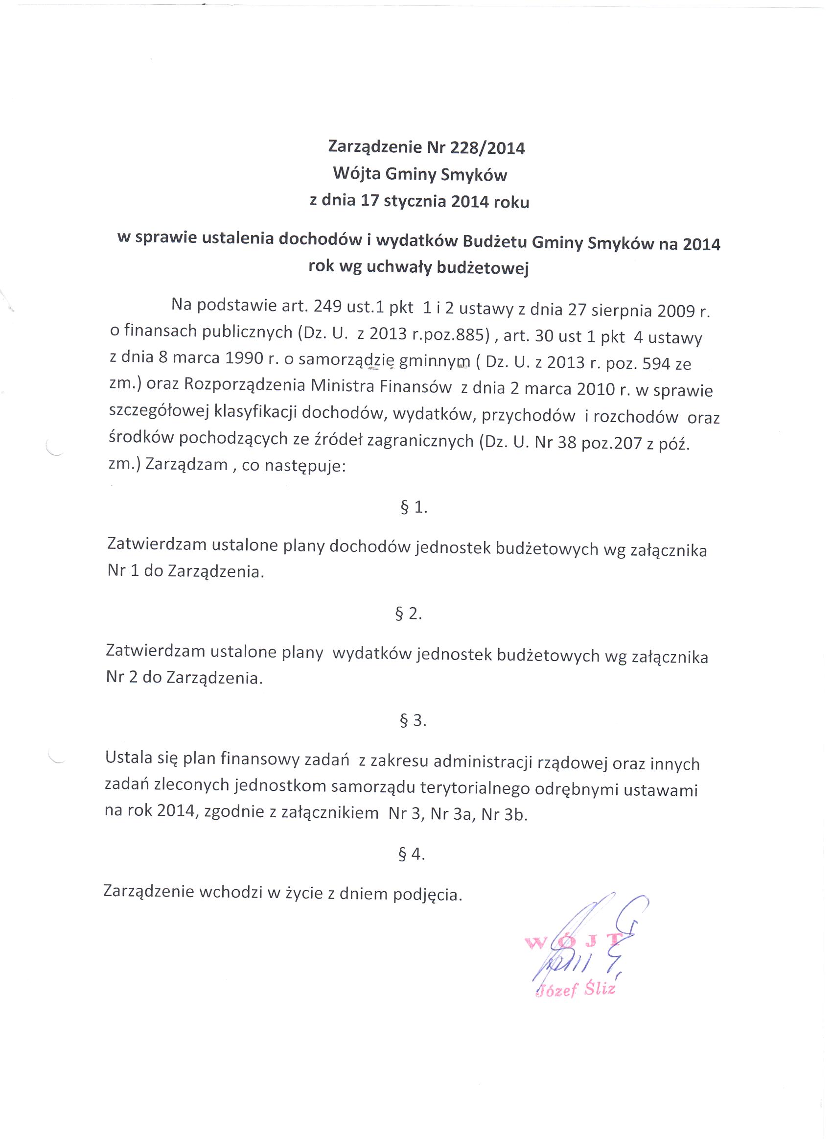 Zarządzenie 228/2014 w sprawie ustalenia dochodów i wydatków Budżetu Gminy Smyków na 2014 rok wg uchwały budżetowej |