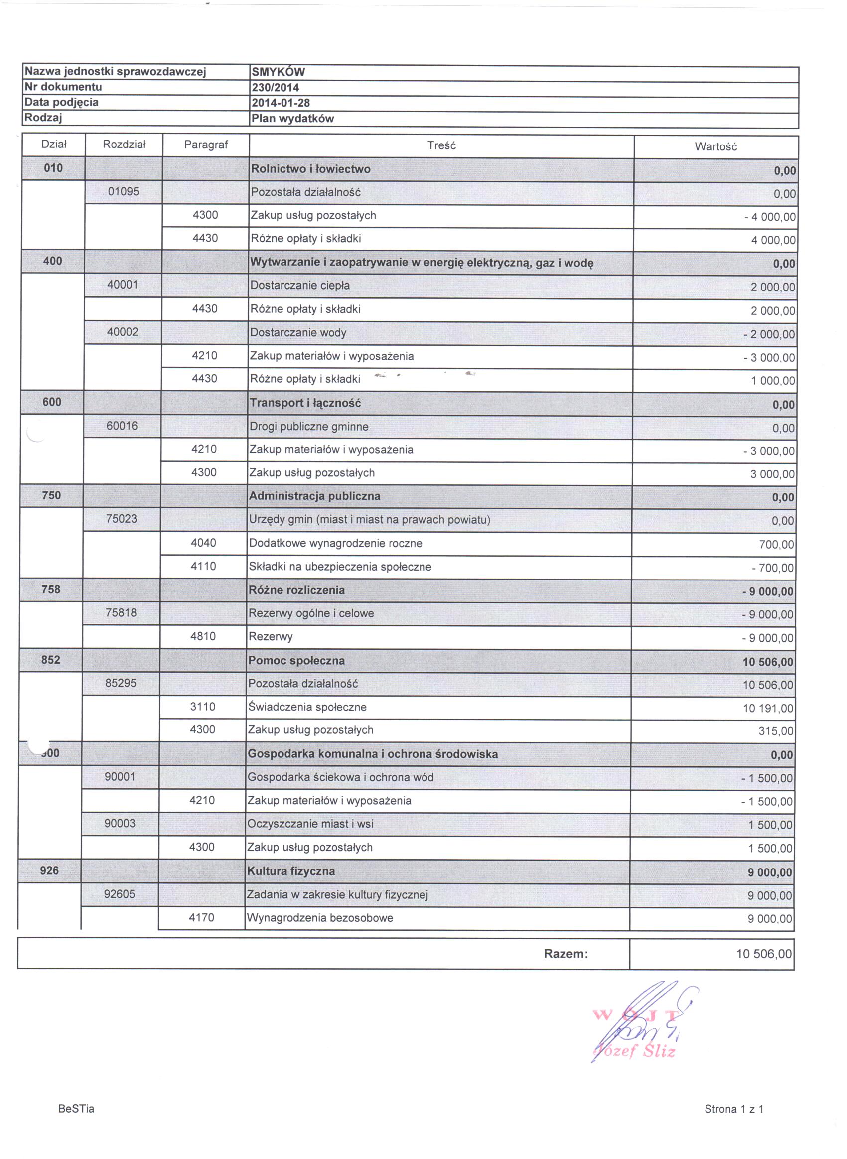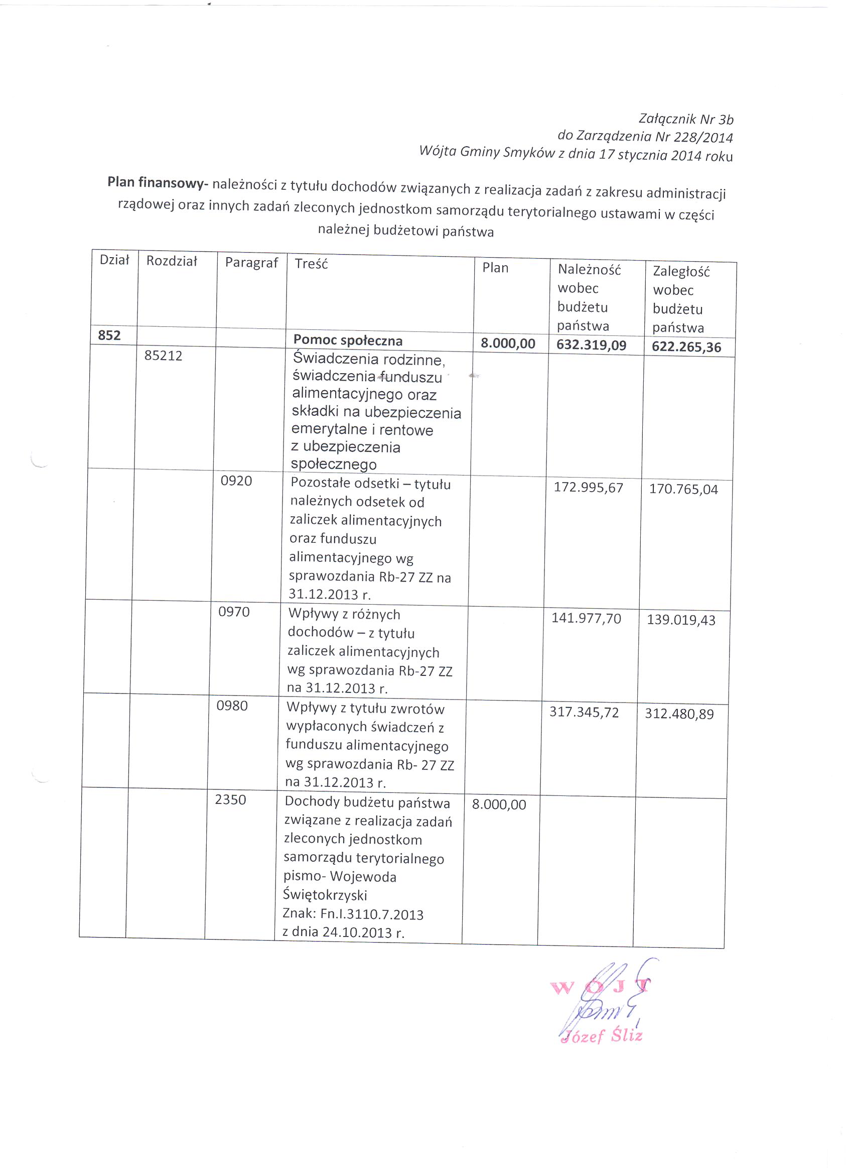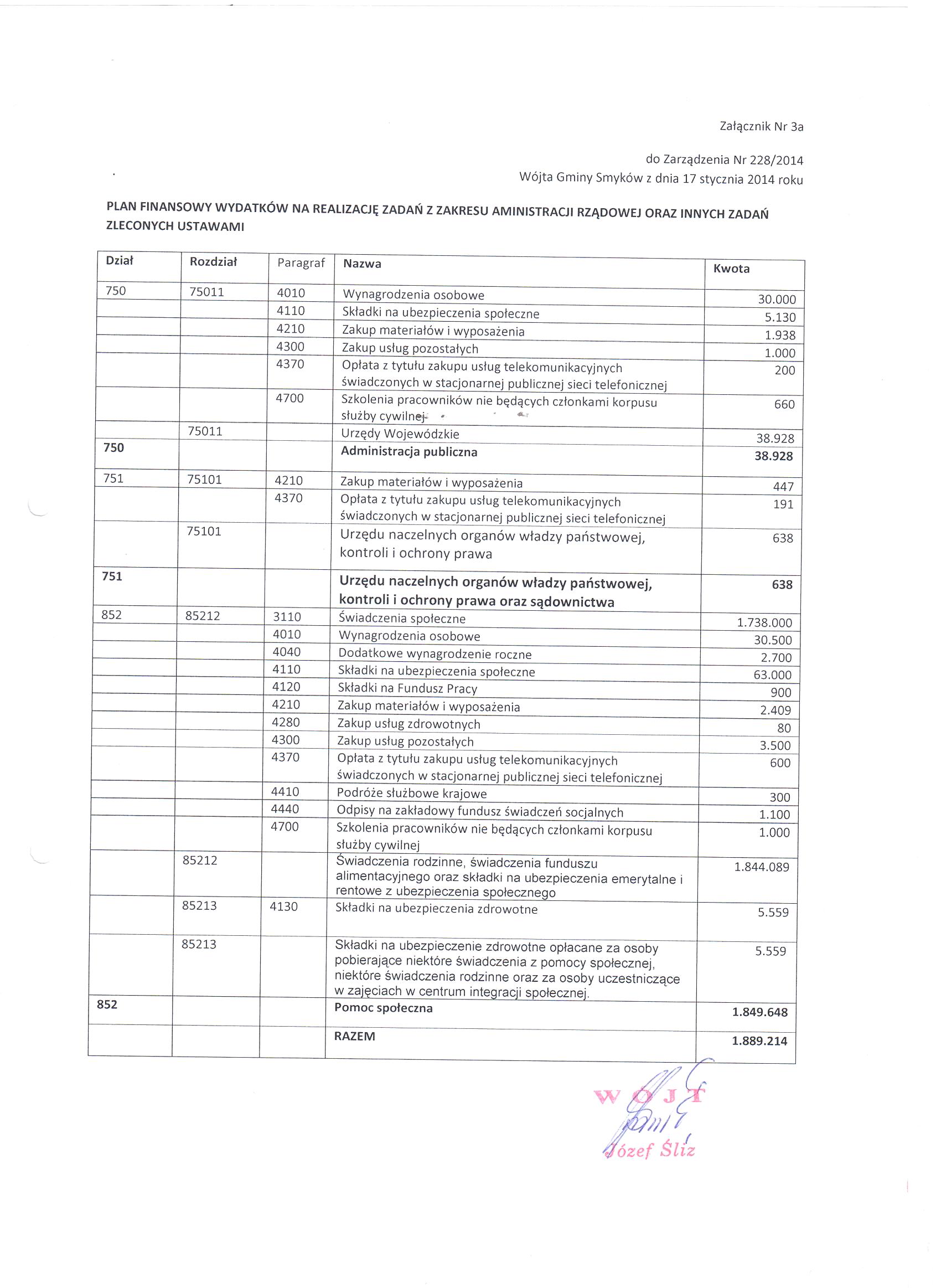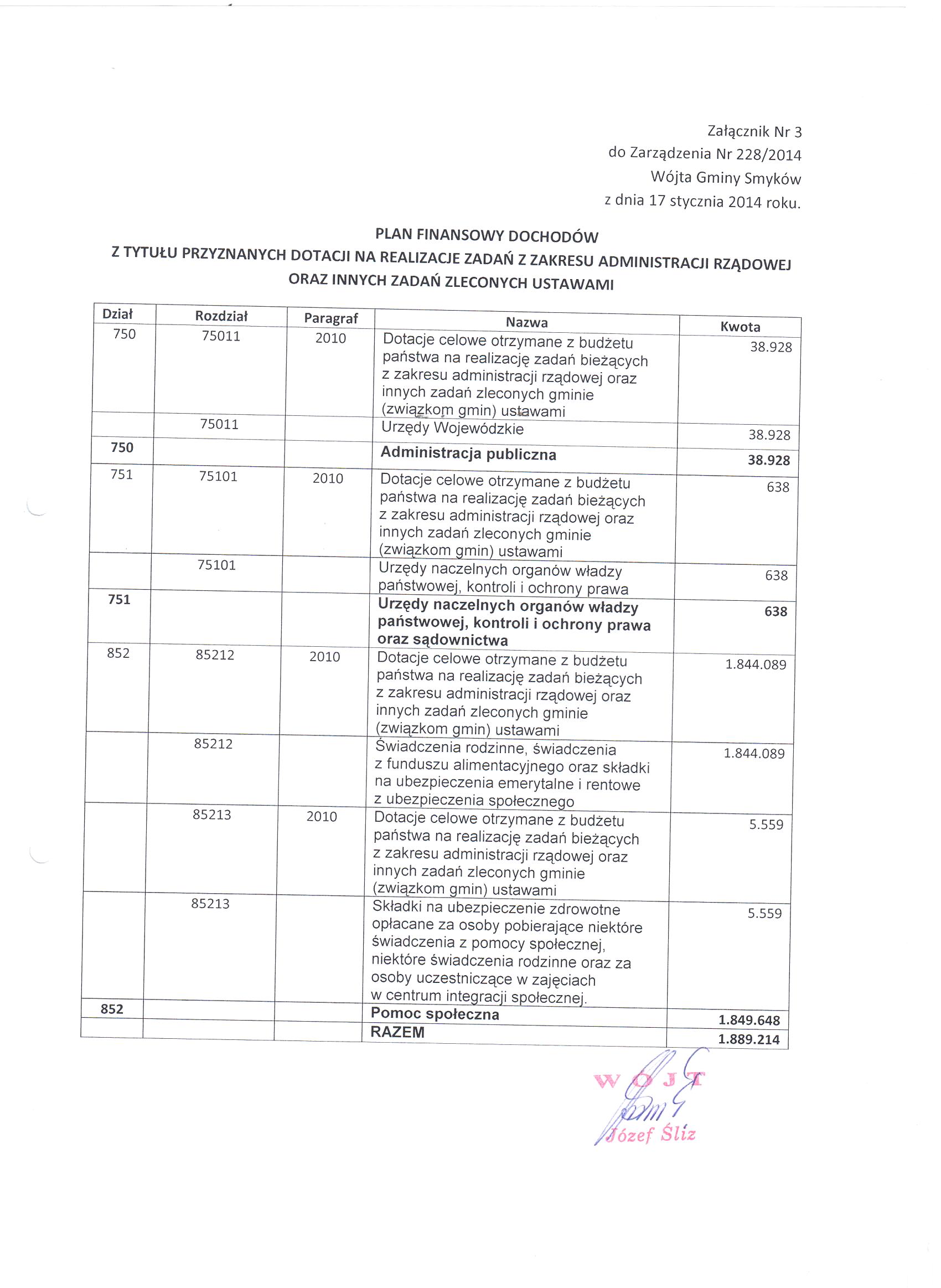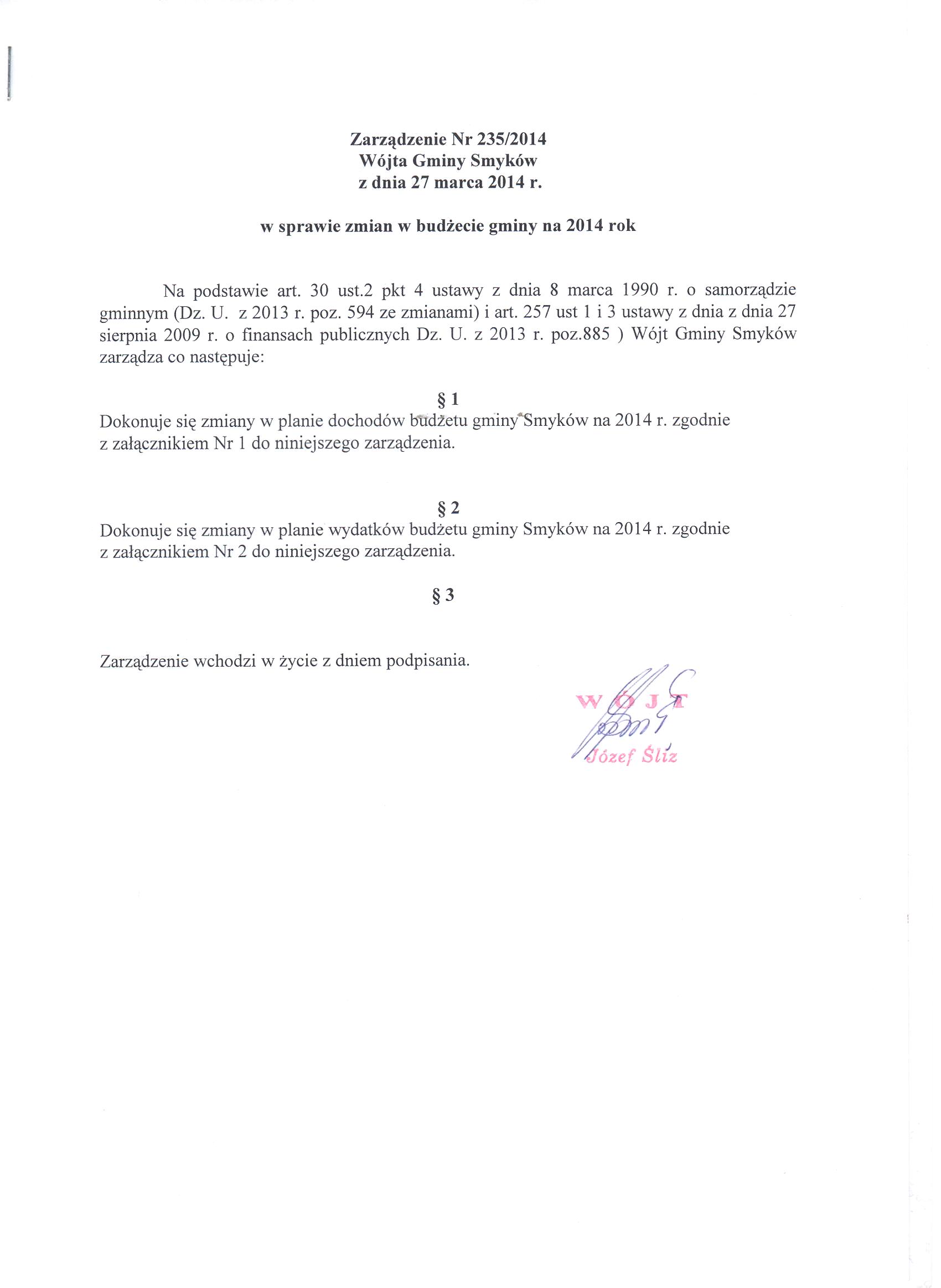 Zarządzenie 228/2014 w sprawie ustalenia dochodów i wydatków Budżetu Gminy Smyków na 2014 rok wg uchwały budżetowej |