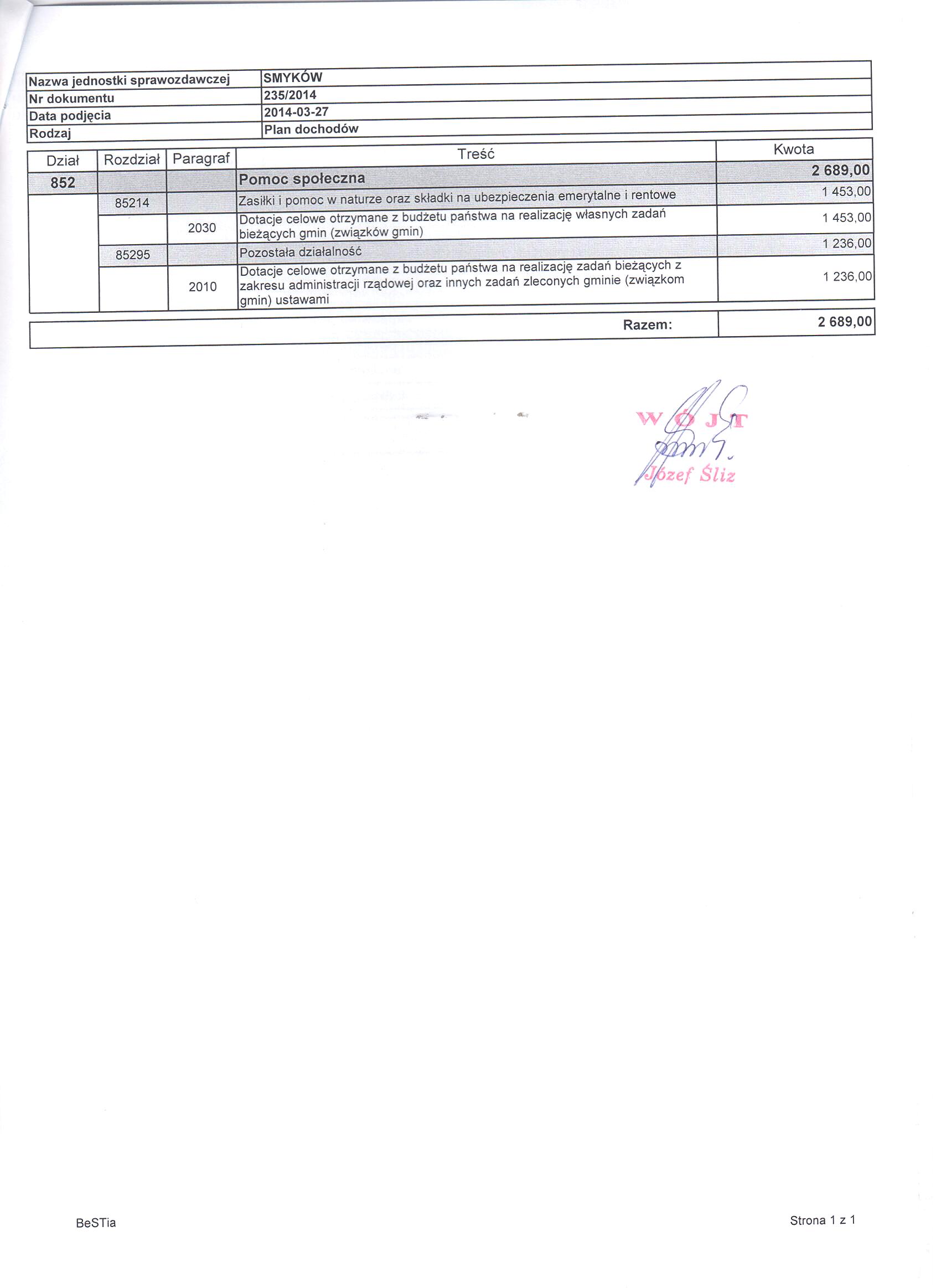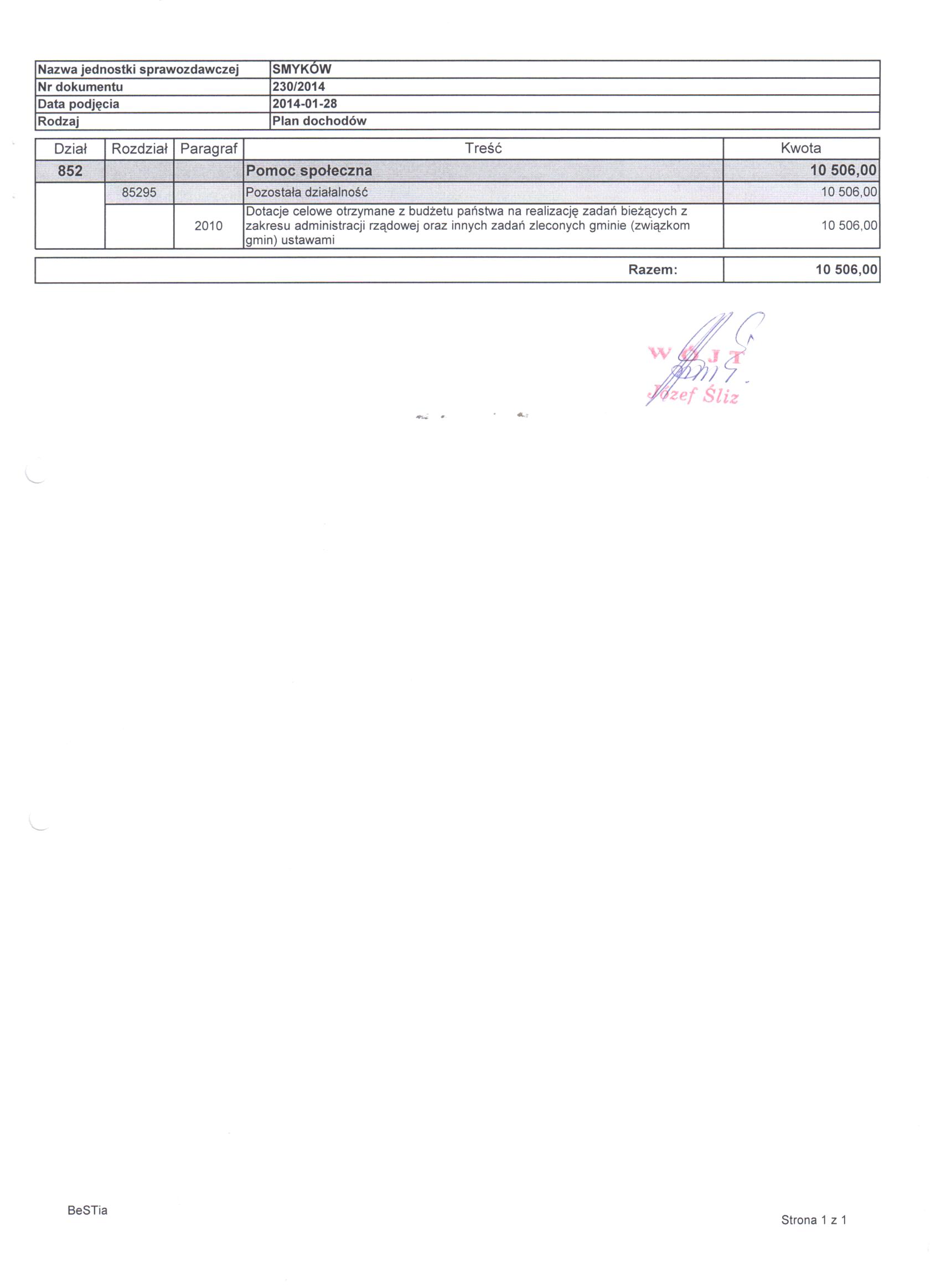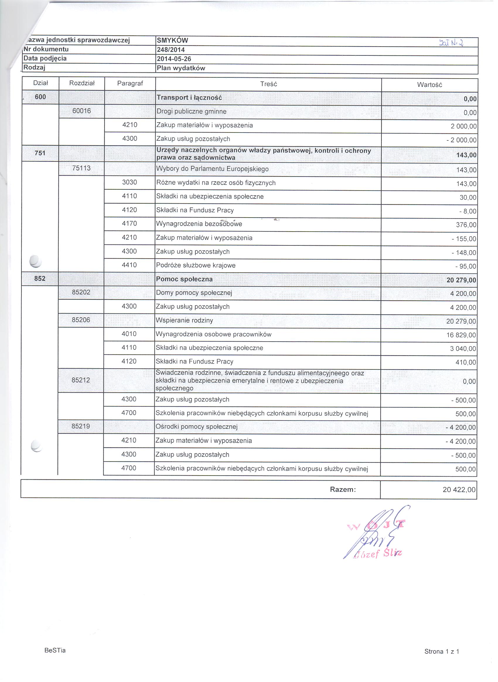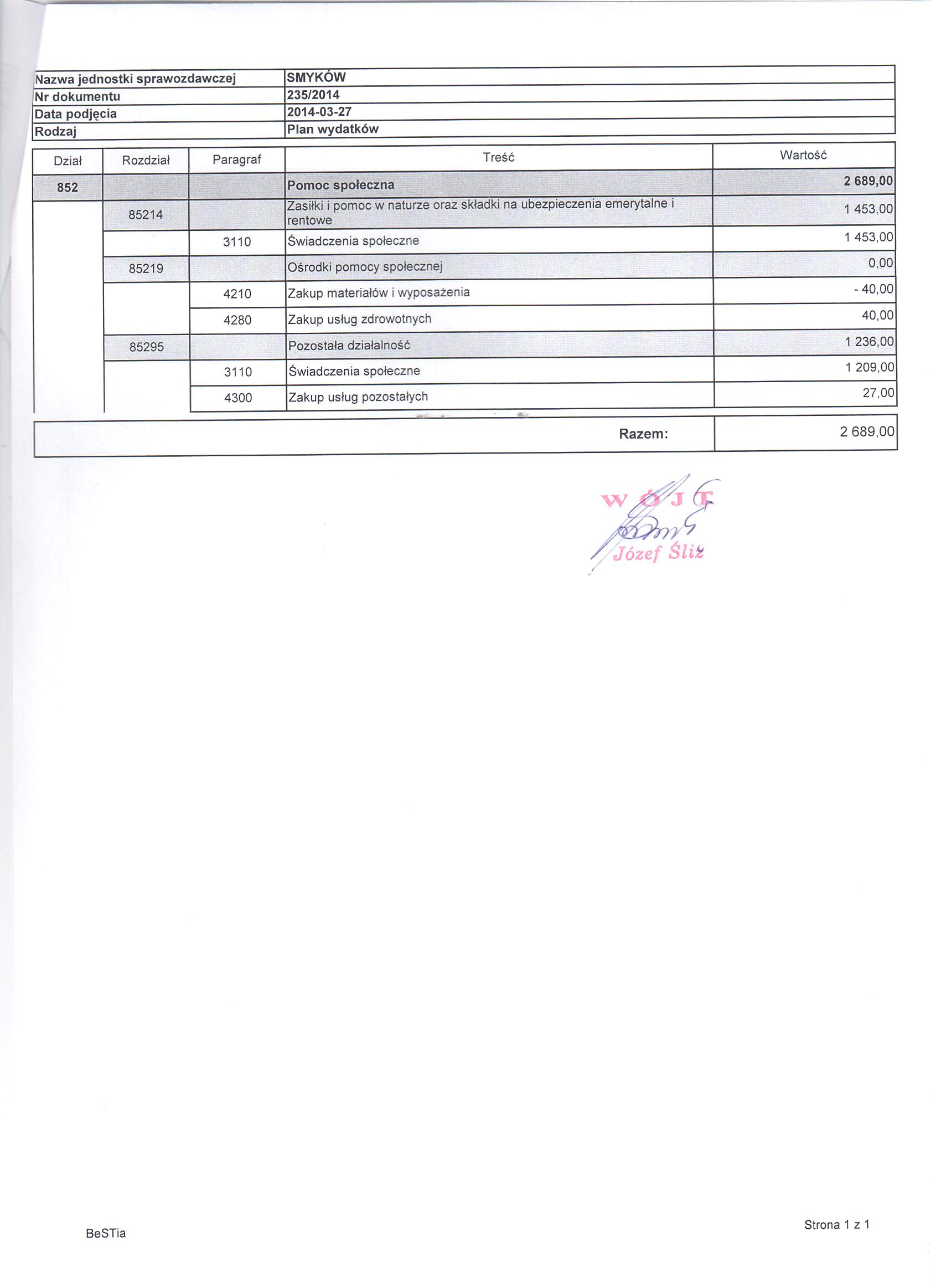 Zarządzenie 228/2014 w sprawie ustalenia dochodów i wydatków Budżetu Gminy Smyków na 2014 rok wg uchwały budżetowej |