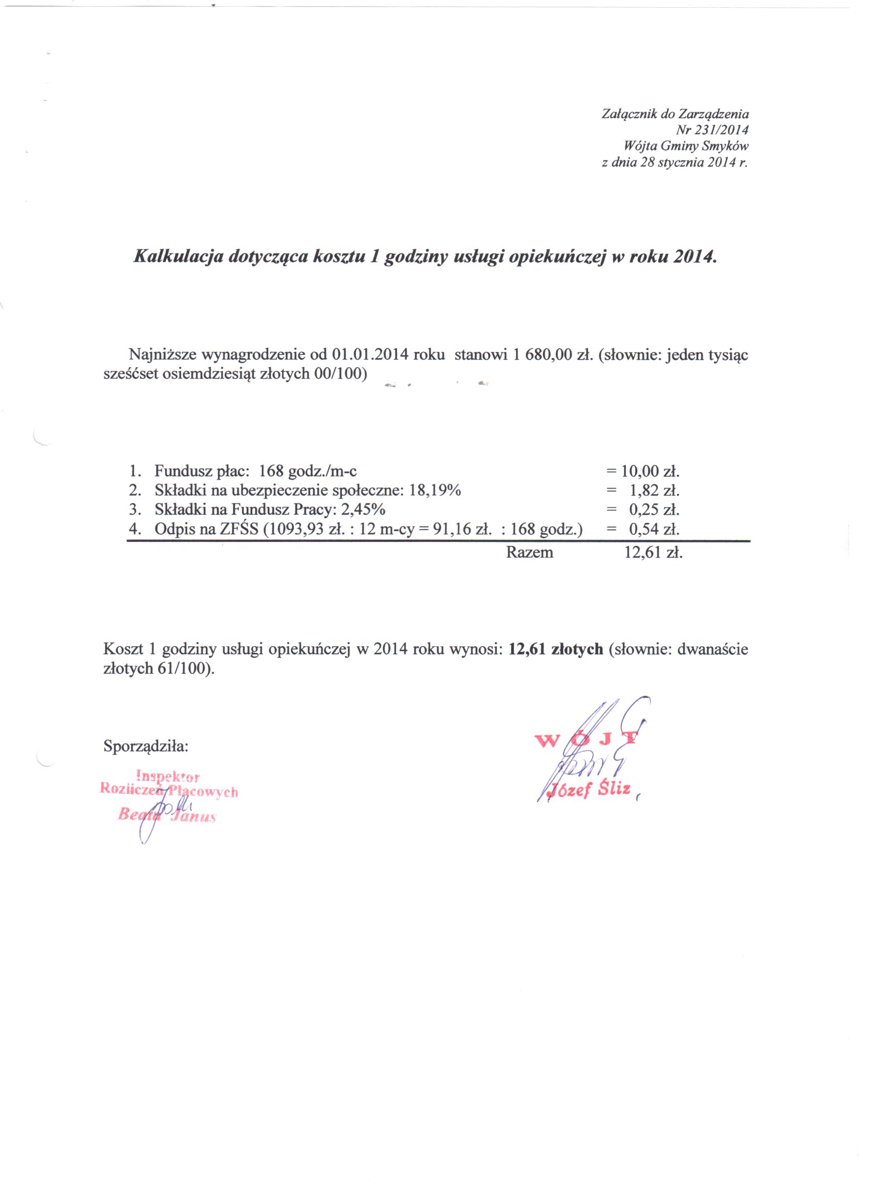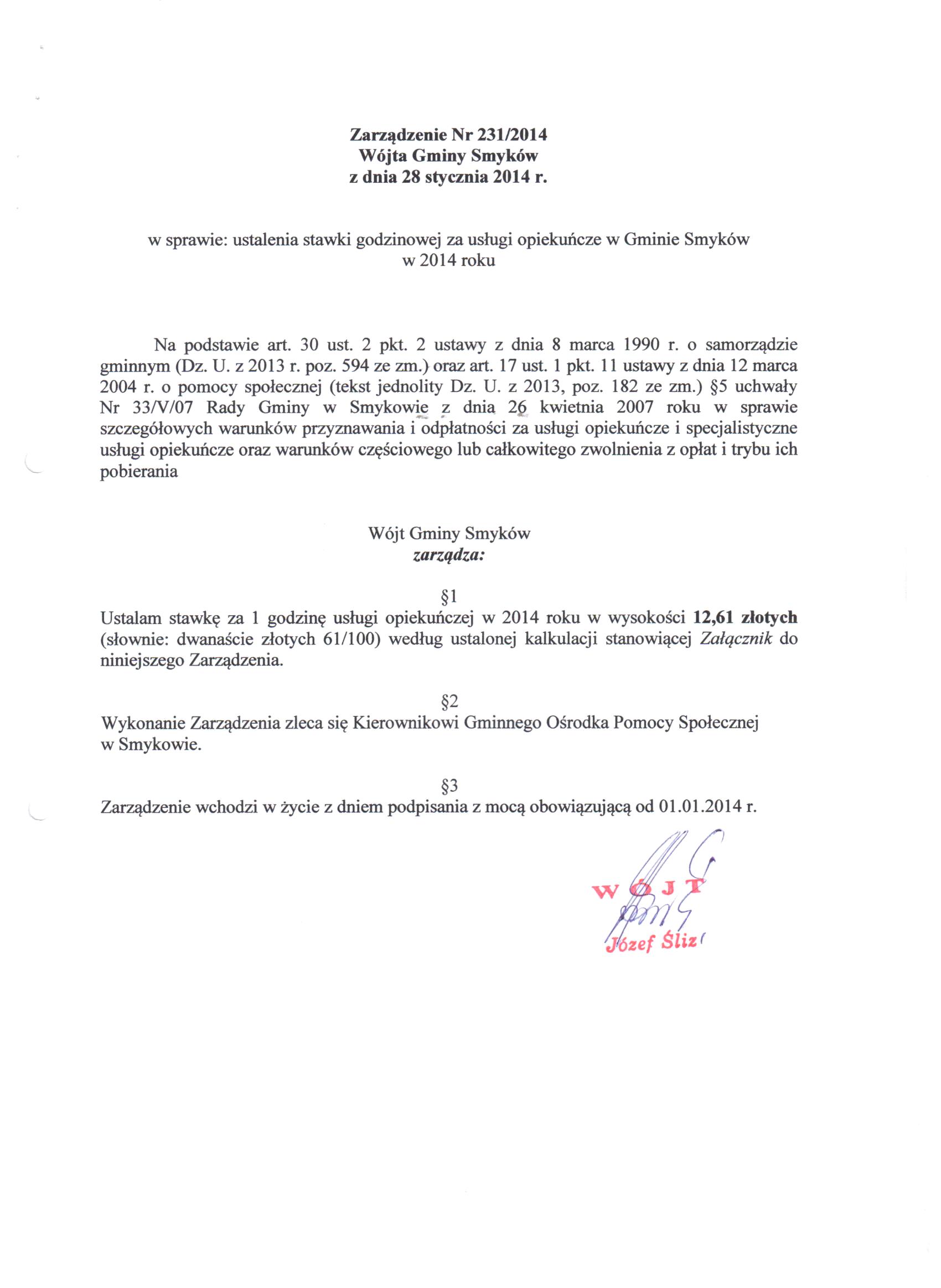Zarządzenie 231/2014 w sprawieustalenia stawki godzinowej za usługi opiekuńcze w Gminie Smyków w 2014 roku. |