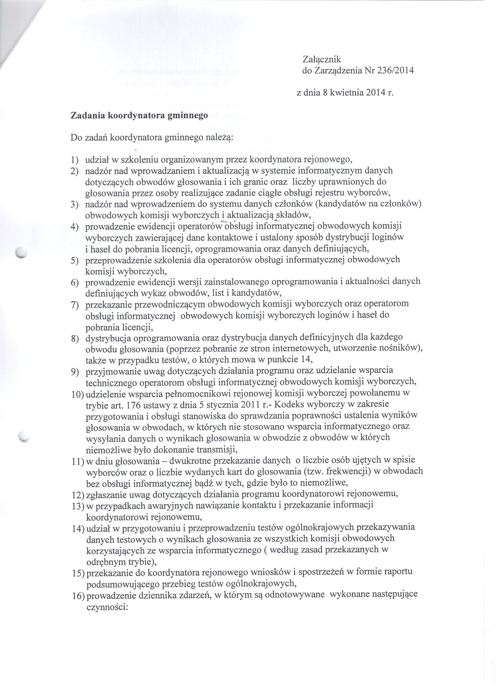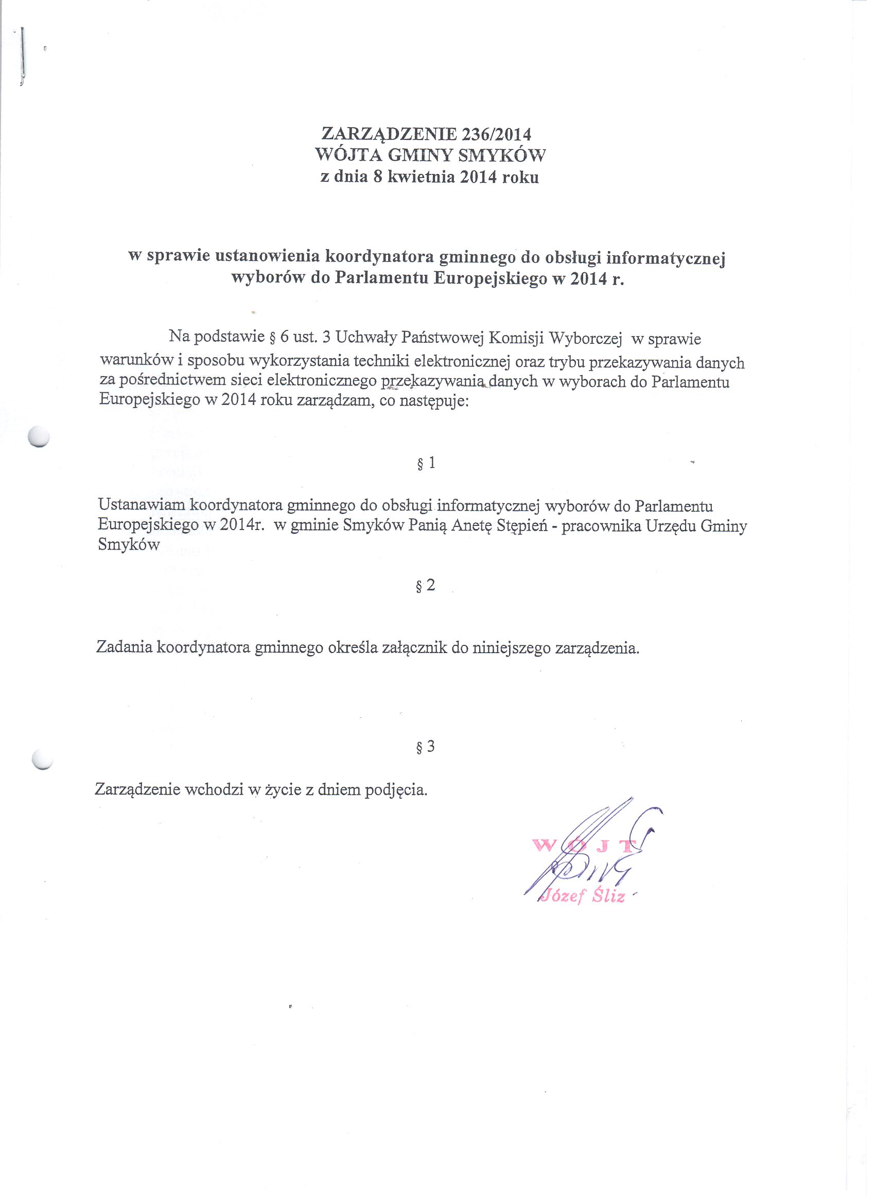 Zarządzenie 236/2014 w sprawie ustanowienia koordynatora gminnego do obsługi informatycznej wyborów do Parlamentu Europejskiego w 2014 roku. |