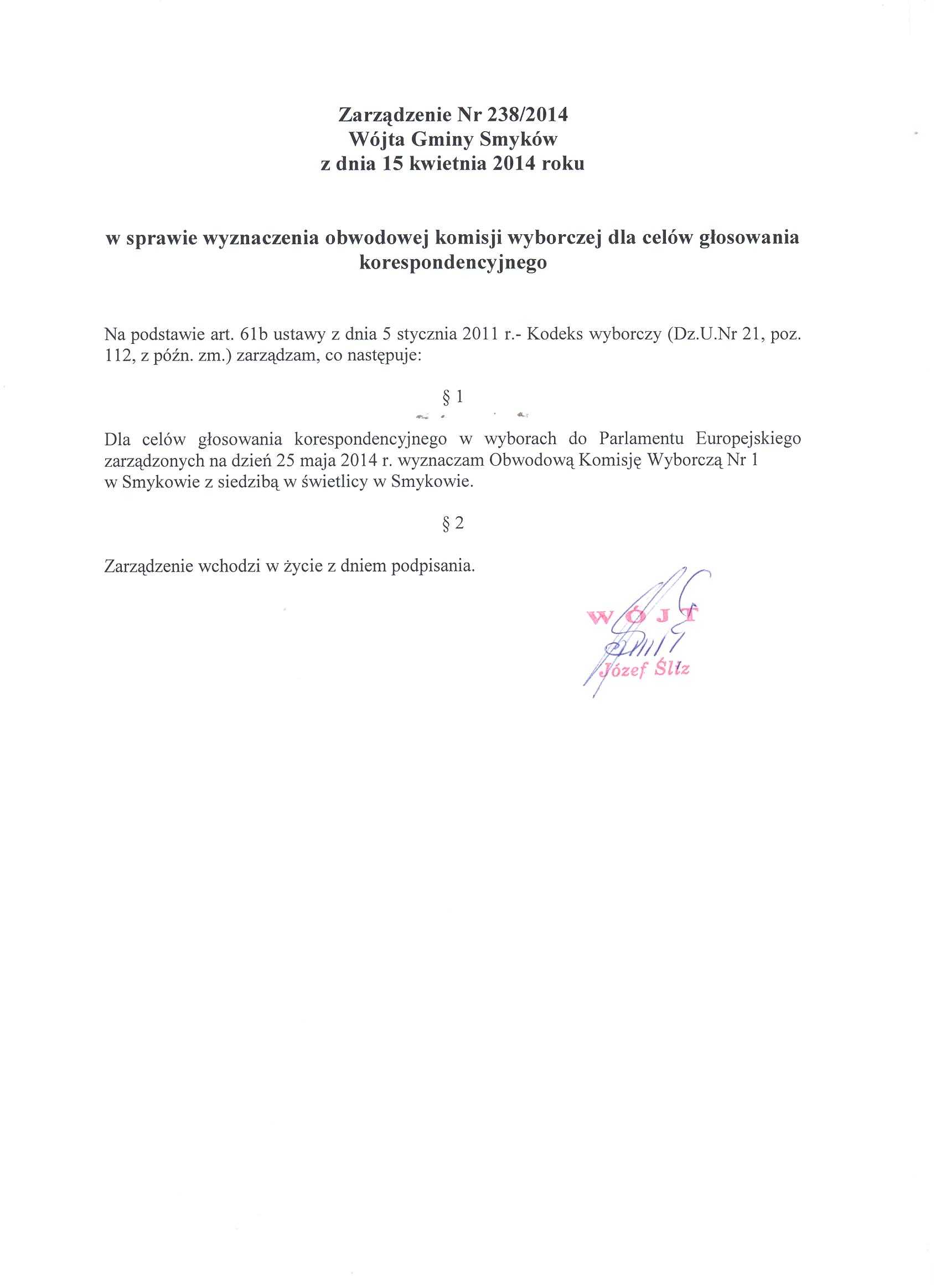 Zarządzenie 238/2014 w sprawie wyznaczenia obwodowej komisji wyborczej dla celów głosowania korespondencyjnego |