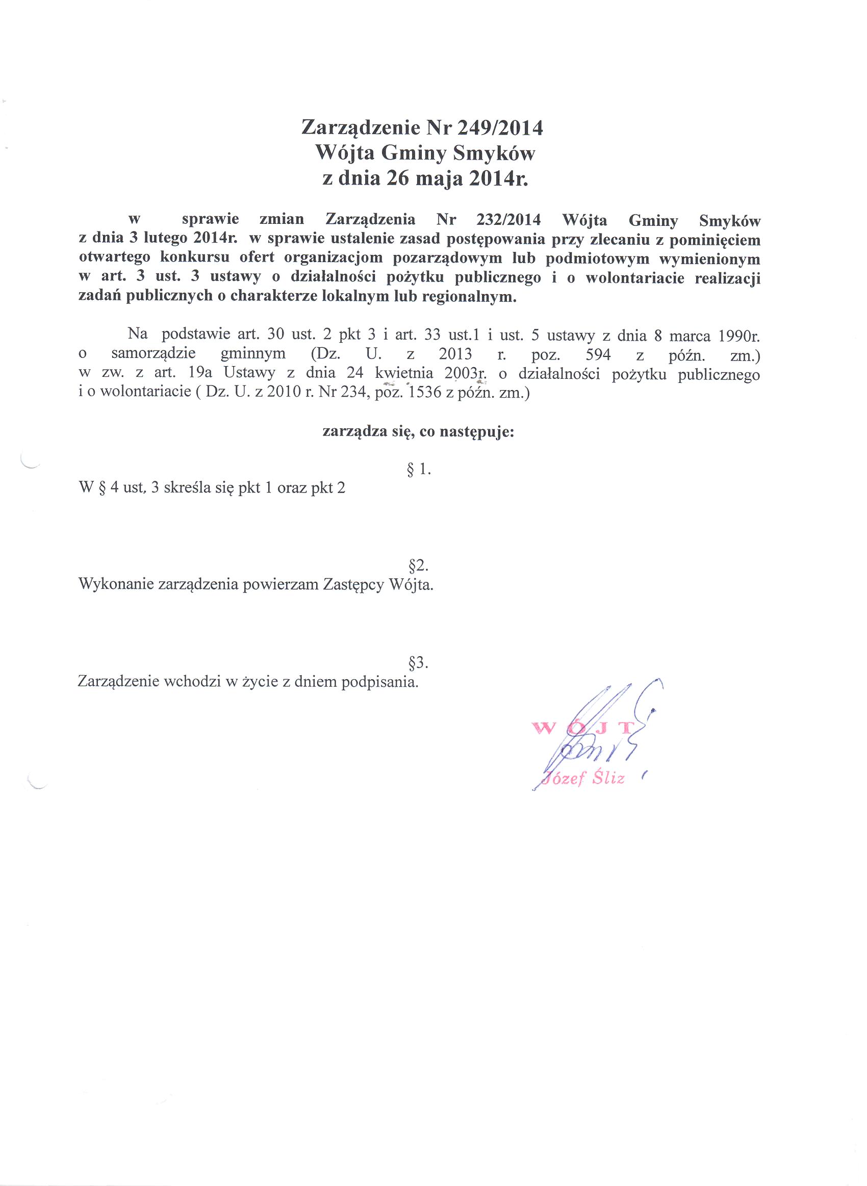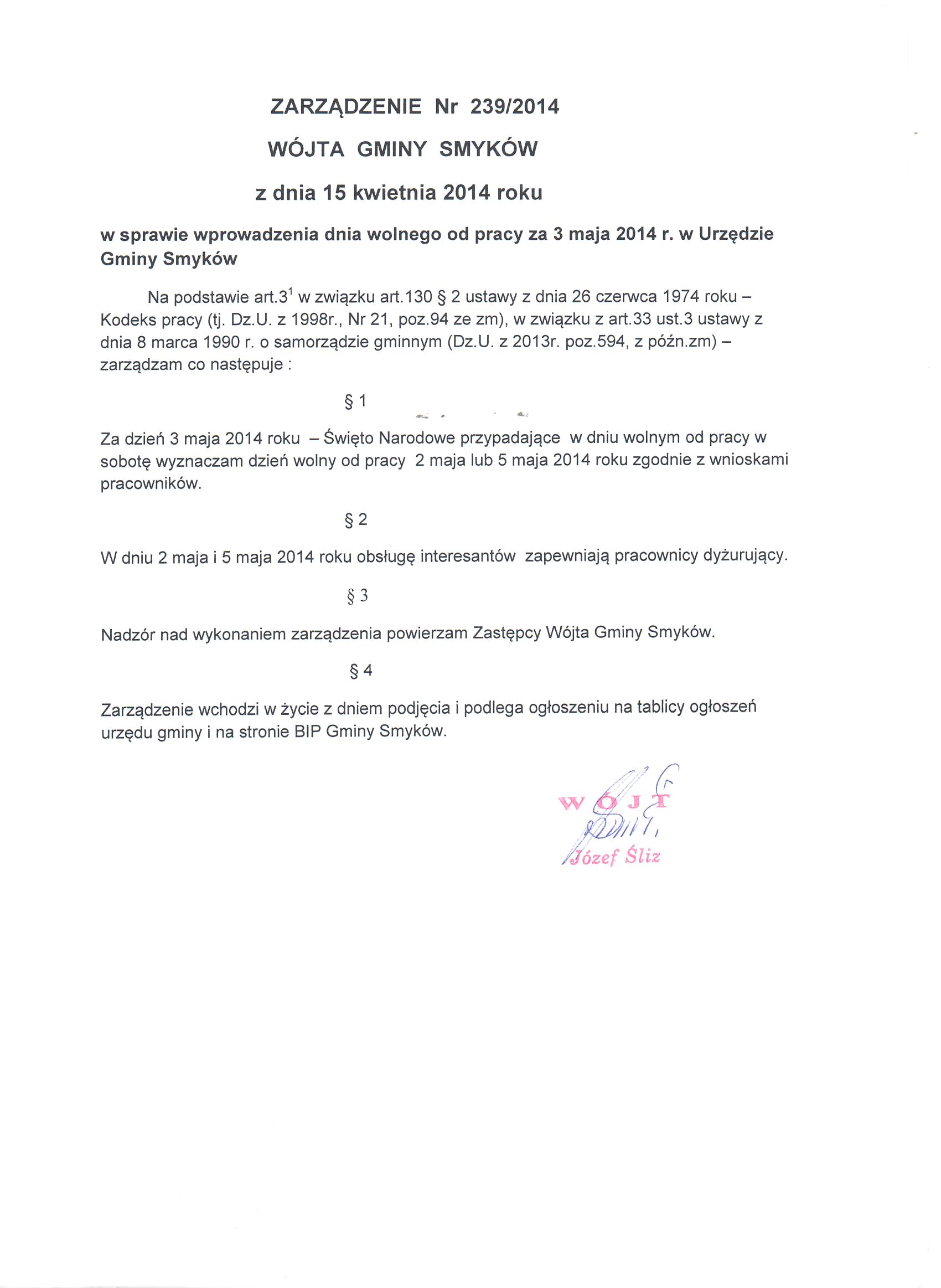 Zarządzenie 239/2014 w sprawie wprowadzenia dnia wolnego od pracy za 3 maja 2014 r. w Urzędzie Gminy Smyków |