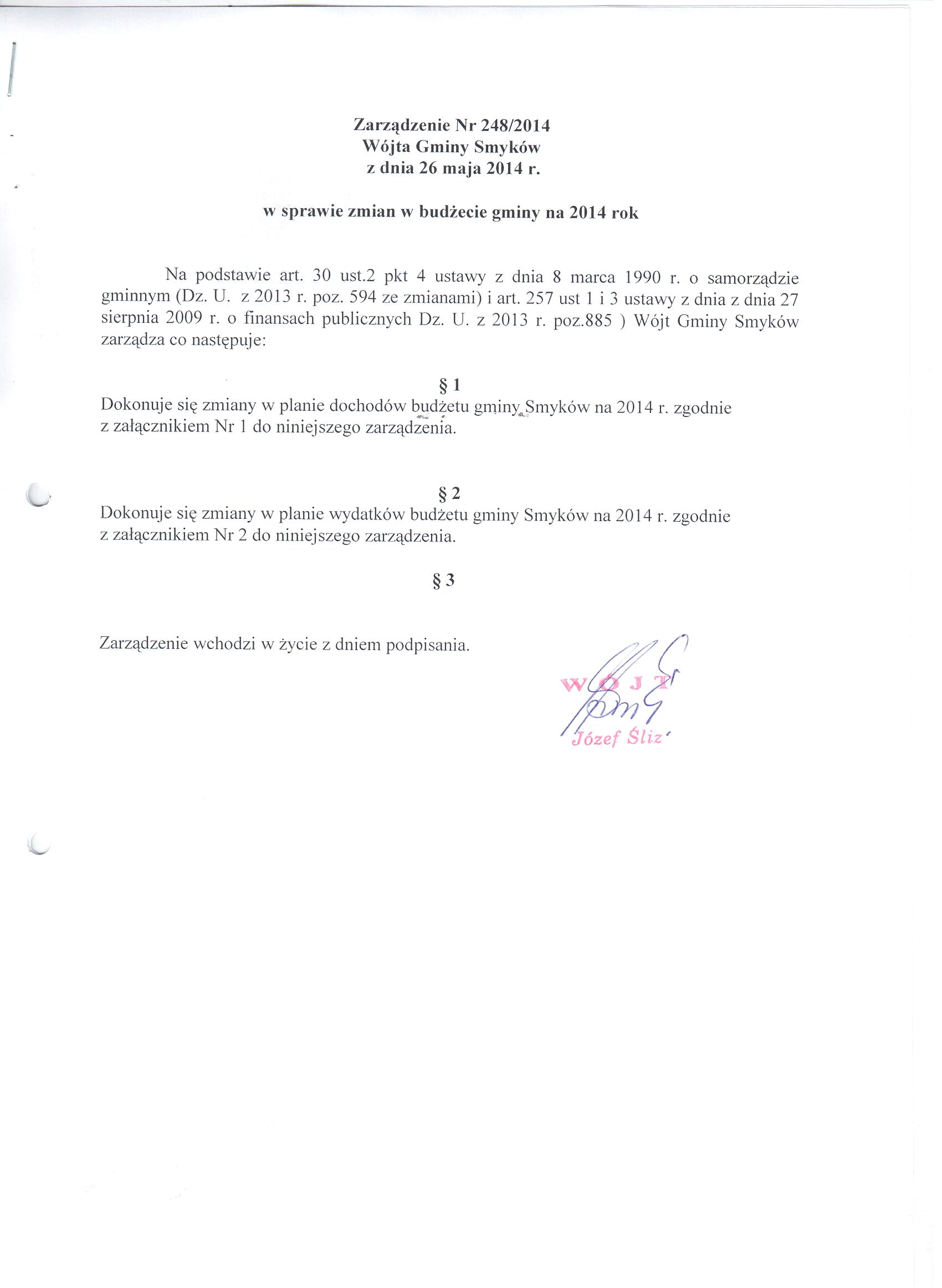 Zarządzenie 248/2014 w sprawie zmian w budżecie gminy na 2014 rok |
