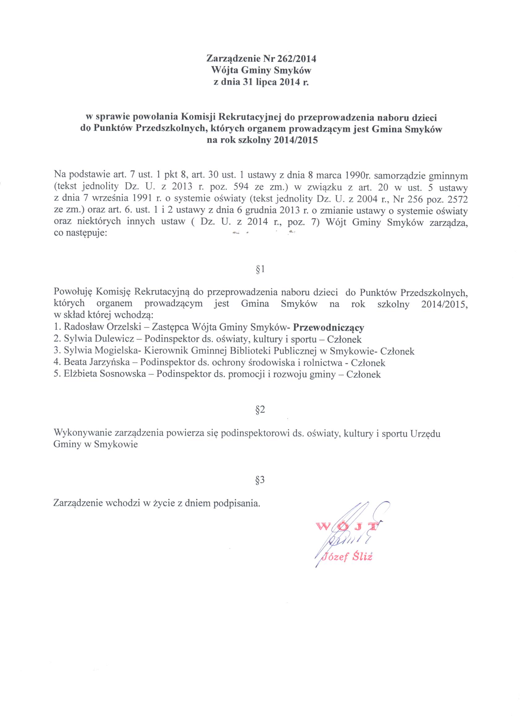 Zarządzenie 262/2014 w sprawie powołania Komisji Rekrutacyjnej do przeprowadzenia naboru dzieci do Punktów Przedszkolnych, których organem prowadzącym jest Gmina Smyków na rok szkolny 2014/2015 |