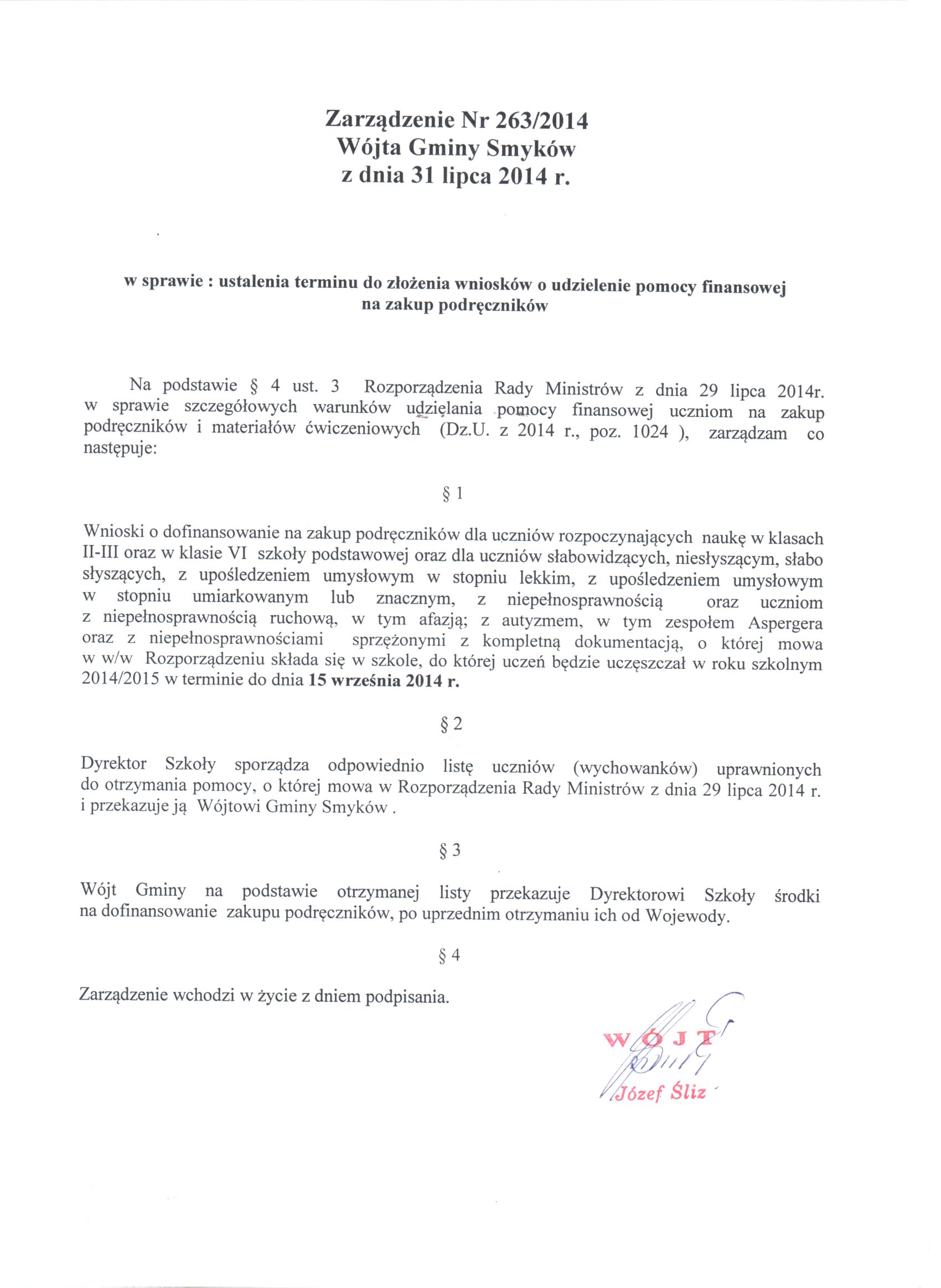 Zarządzenie 263/2014 w sprawie ustalenia terminu do złożenia wniosków o udzielenie pomocy finansowej na zakup podręczników |