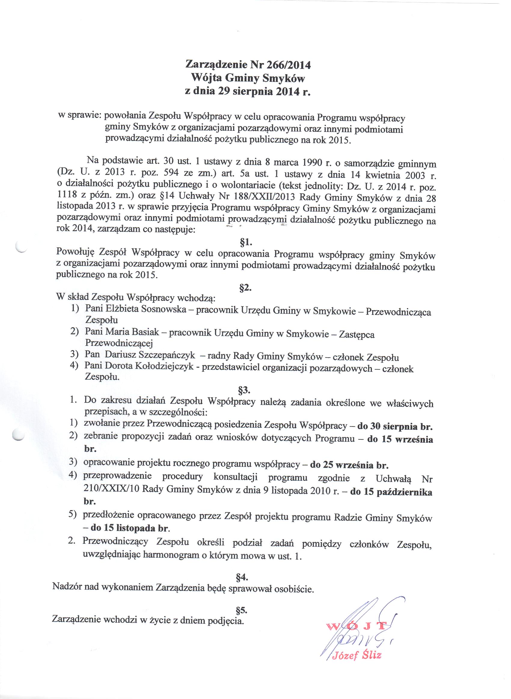 Zarządzenie Nr 274/2014 w sprawie zmian w Regulaminie Organizacyjnym Urzędu Gminy w Smykowie |