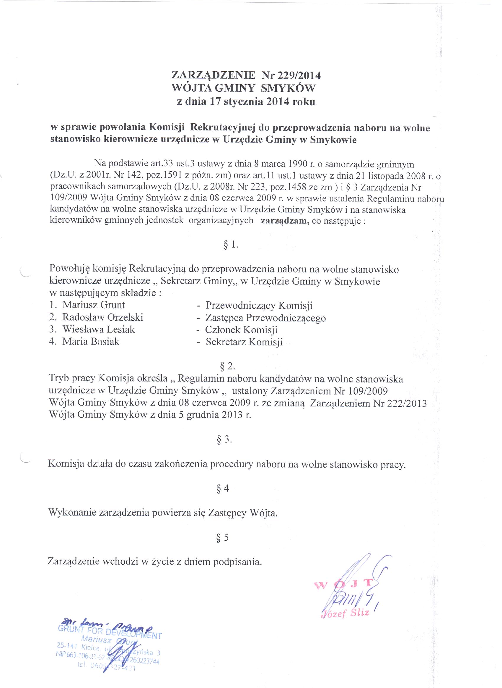 Zarządzenie 229/2014 w sprawie powołania Komisji Rekrutacyjnej do przeprowadzenia naboru na wolne stanowisko kierownicze urzędnicze w Urzędzie Gminy w Smykowie |