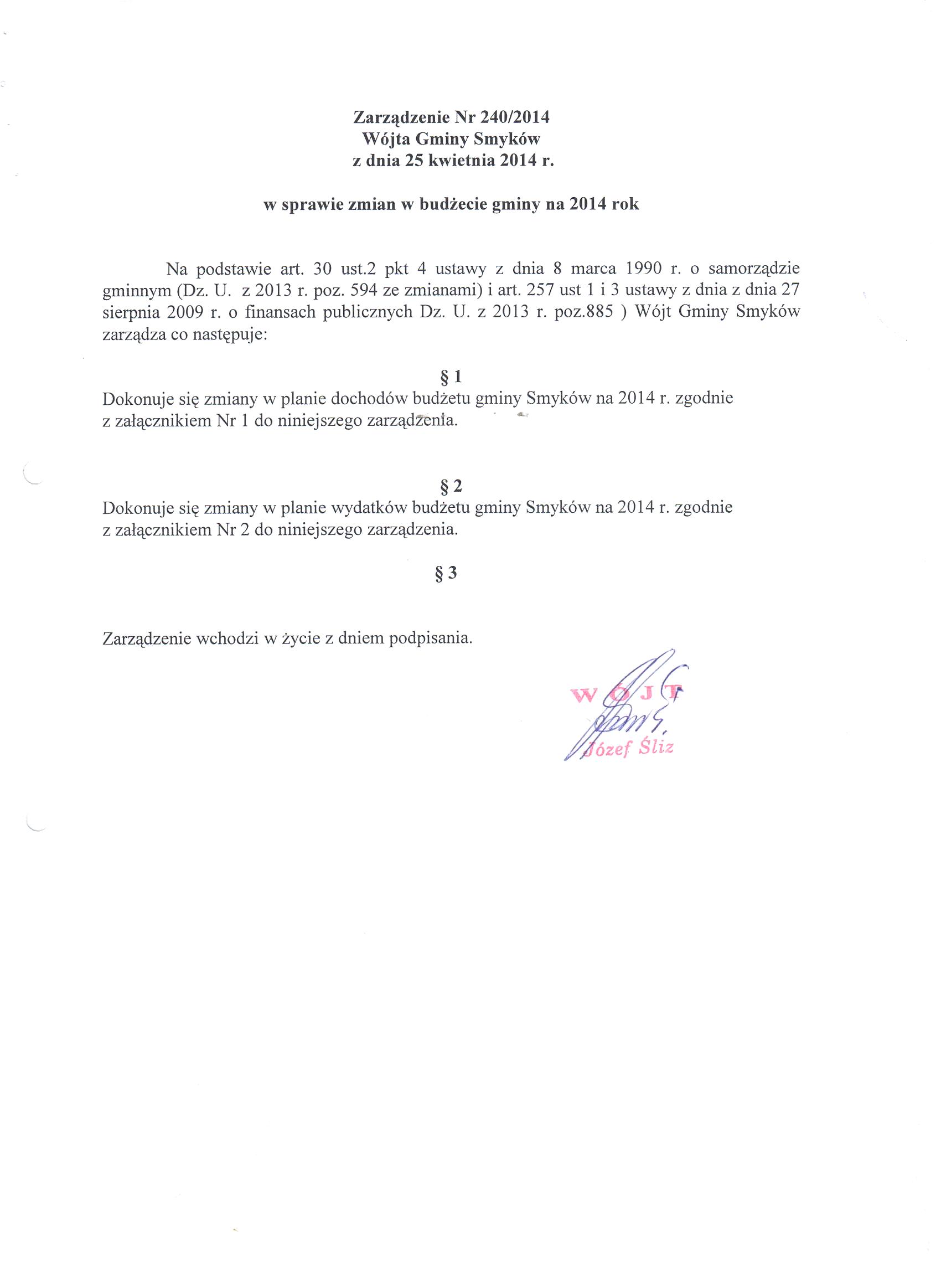 Zarządzenie 240/2014 w sprawie zmian wbudżecie gminy na 2014 r |