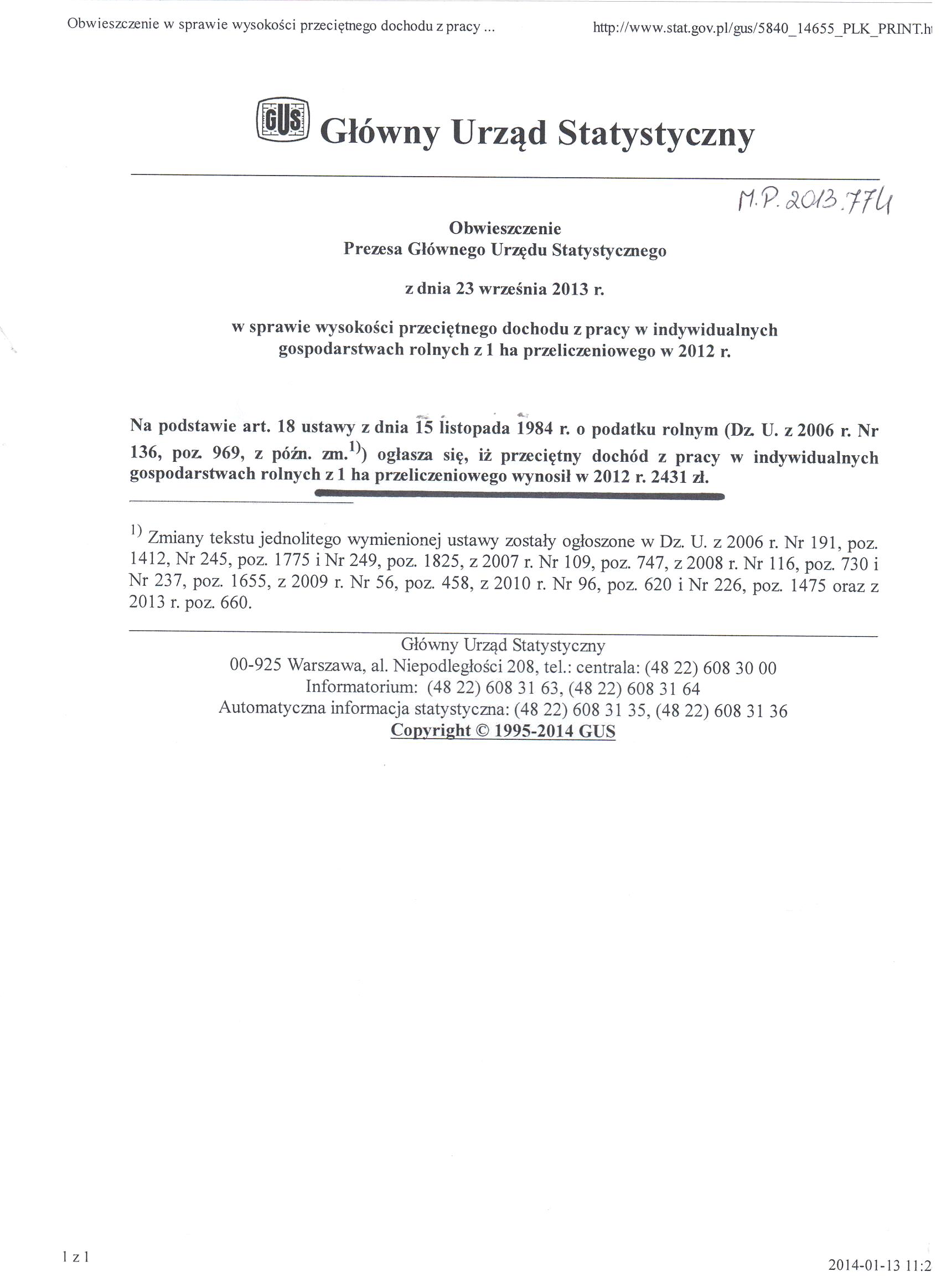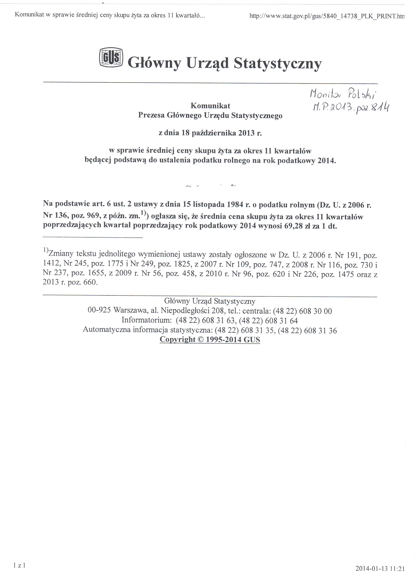 Podstawa wg której naliczany jest podatek rolny na 2014 rok |