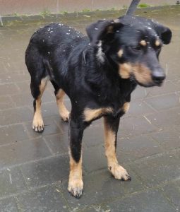 Opis zwierzęcia: Gatunek – pies. Płeć – samiec. Rasa – mieszaniec. Wiek – ok. 2 lata. Maść – czarno-podpalany. Waga – ok. 15 kg. Nieagresywny.